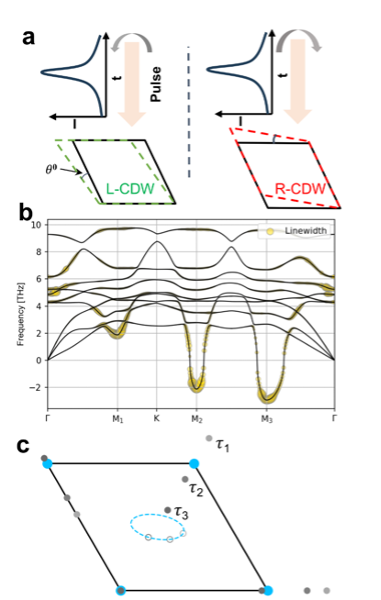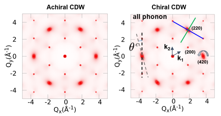 手性电荷密度波(chiral CDW)是一种通常出现于低温下的关联电子物态,其表现为电荷密度在空间中的周期性调制,并伴随着破缺镜面以及中心对称性的晶格结构畸变。这种物态被认为与许多新奇的物理现象有关,例如非局域霍尔效应、手性库伯对(chiral Copper pairs)、轴子绝缘体(Axion insulator states)等。但是,到目前为止,人们对手性电密度波形成的机理还没有一个足够的认识,目前被发现具有手性电荷密度波的材料也少之又少。理解手性密度波形成的理论机制不仅仅有利于发现合成更多的举要该物态的材料,更有利于深入研究相关的物性。中国科学院理论物理研究所的张田田副研究员团队,结合理论分析以及第一性原理计算,提出在通过电声耦合诱导的电荷密度波相变体系中,手性声子(chiral phonon)的软化是一种诱导手性电荷密度波的可能机制,如图1所示。同时,他们通过计算考虑多声子热扩散效应的X射衍,首次提出了X射线衍射峰的各向异性可作为实验上探测手性电荷密度波的有效标记。