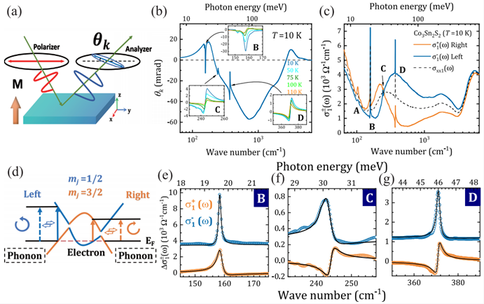 近日,由东南大学杨润副教授(第一作者)、斯图加特大学Martin Dressel教授课题组(通讯作者)、中国科学院物理研究所邱祥冈课题组、中国科学院理论物理研究所张田田副研究员(共同通讯)组成的研究团队在《Physical Review Letters》杂志发表了一篇题为“Inherent Circular Dichroism of Phonons in Magnetic Weyl Semimetal Co3Sn2S2”的研究论文(DOI: 10.1103/PhysRevLett.134.196905),报道了在磁性外尔半金属Co3Sn2S2中,通过红外光谱学实验观测到无外场下声子呈现圆偏振现象。
