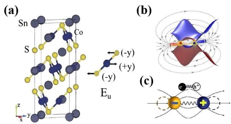 图1:(a) 磁性外尔半金属Co3Sn2S2的晶格结构和其中红外活性的Eu模式振动。(b)Co3Sn2S2中的拓扑能带。(c)电声子耦合示意图。