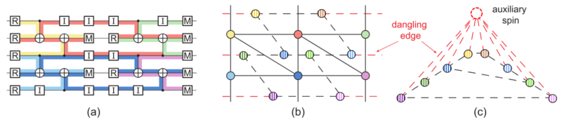 图 1:(a). 码距为3且重复观测轮数为2的重复码纠错线路。(b). 探测器噪音模型对应的纠错图(实线)及其对偶图(虚线)。(c). 增加辅助自旋后构成的平面伊辛模型示意图。