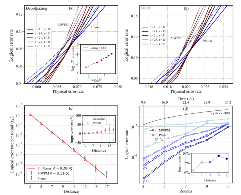 在论文中,作者用大量的数值实验验证了严格解码方法的优越性。首先,对于已知噪音模型(例如退极化噪声和超导SI1000噪音模型)的重复码,新方法首次得到了严格的纠错阈值,如图2 (a) 和 (b)所示;其次,在谷歌最新的量子存储实验的实测数据之上[3],论文作者对其重复码解码过程进行了重新解析并得到了比谷歌所使用方法更低的逻辑错误率,以及更小的“错误压低因子”图2 (c),也因此展示了谷歌实验中的误差至少有四分之一不是来源于其所宣称的未知错误源,而是谷歌所采用的解码算法;最后,北京量子信息科学研究院的团队在72量子比特的芯片上开展了不同码距的无重置操作重复码量子存储纠错实验。在相关实验数据上的解码结果展示了在非理想的噪音模型条件下Planar算法仍然有相较于MWPM的显著优势,如图2 (d)所示。