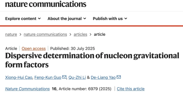 近日,由中国科学院理论物理研究所曹雄辉助理研究员、郭奉坤研究员,四川大学李衢智助理研究员和湖南大学姚德良教授组成的研究团队在Nature Communications上发表了题为“Dispersive determination of nucleon gravitational form factors”的研究论文,首次利用模型无关的方法,精确确定了真实世界中核子的引力形状因子。