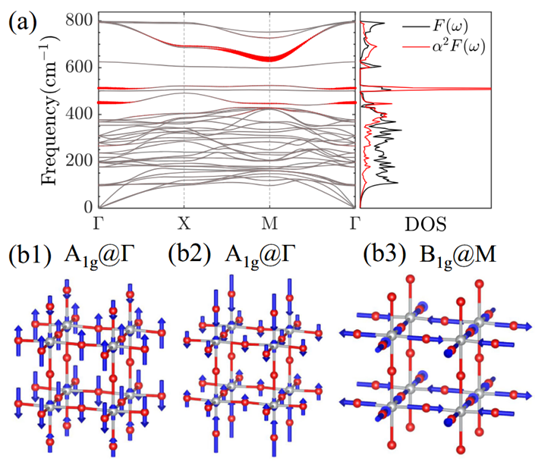 图1.(a)双层镍基超导体在30GPa下的声子谱、线宽、态密度和谱函数;(b1,b2,b3)三种电声耦合强度较大的声子模式。