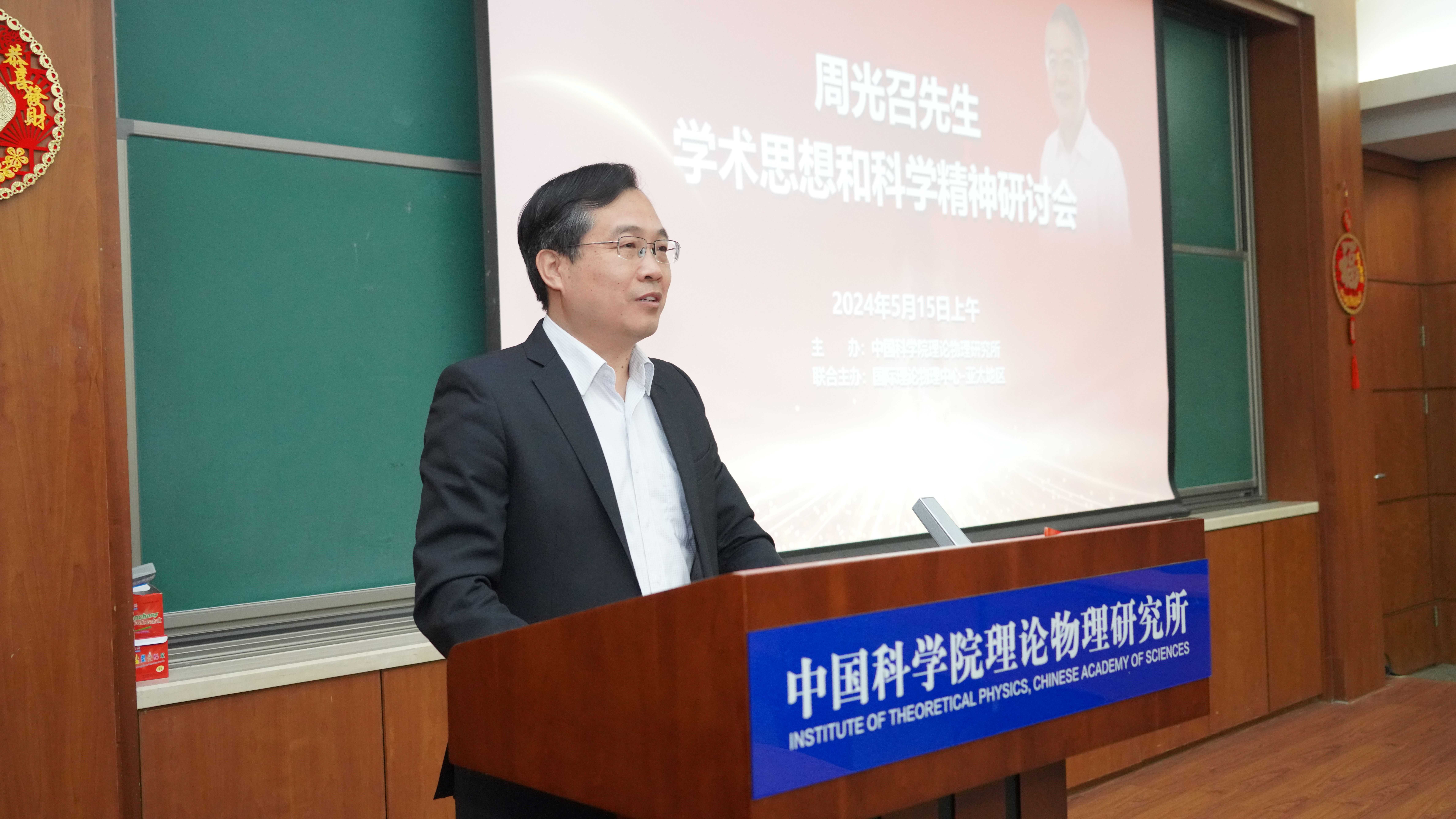 樊志军向大家介绍参会的领导和嘉宾。周善贵致欢迎词。他说道,周光召先生是理论物理所的第二任所长,他将“两弹一星”精神运用到建设和发展理论物理所的实际中,提出了“开放、流动、竞争、联合”的办所方针和“开放、交融、求真、创新”的办所理念,引领理论物理所服务全国理论物理学界。周先生多次强调“理论物理只有世界第一,没有第二”,要瞄准国家重大需求和世界科学前沿,做出国际一流的科研工作。周光召先生的学术思想和科学精神为我们的时代树立了丰碑。