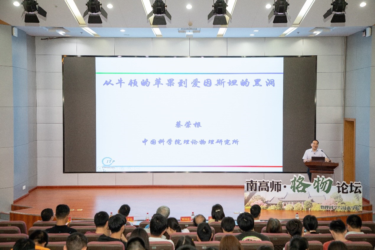 揭牌仪式结束后,蔡荣根院士在“南高师格物论坛”上为全体参会师生作了题为从牛顿的苹果到爱因斯坦的黑洞的学术报告,报告由张力发教授主持。