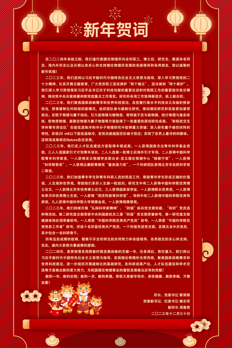 在二〇二四年来临之际,我们谨代表理论物理所向全所职工、博士后、研究生、离退休老同志、海内外所友以及长期以来关心和支持理论物理所发展的各级领导和各界朋友,致以诚挚的新年祝福!