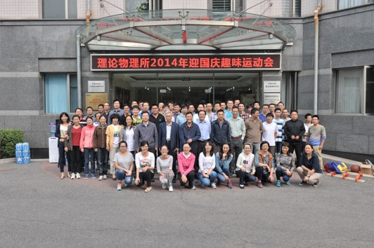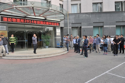 为庆祝建国、建院65周年,进一步丰富广大职工和研究生的业余文化活动,强化健身意识,以强健的体魄投入到国家和科学院的建设中,理论物理所于2014年9月28日上午成功举办了迎国庆趣味运动会。科研骨干、博士后、研究生以及管理和支撑部门职工80余人参加了此次趣味运动会,欧阳钟灿院士、张肇西院士、邹冰松所长、牟克雄书记、陈晓松副所长也作为队员参加了比赛。所长邹冰松宣布运动会开幕。