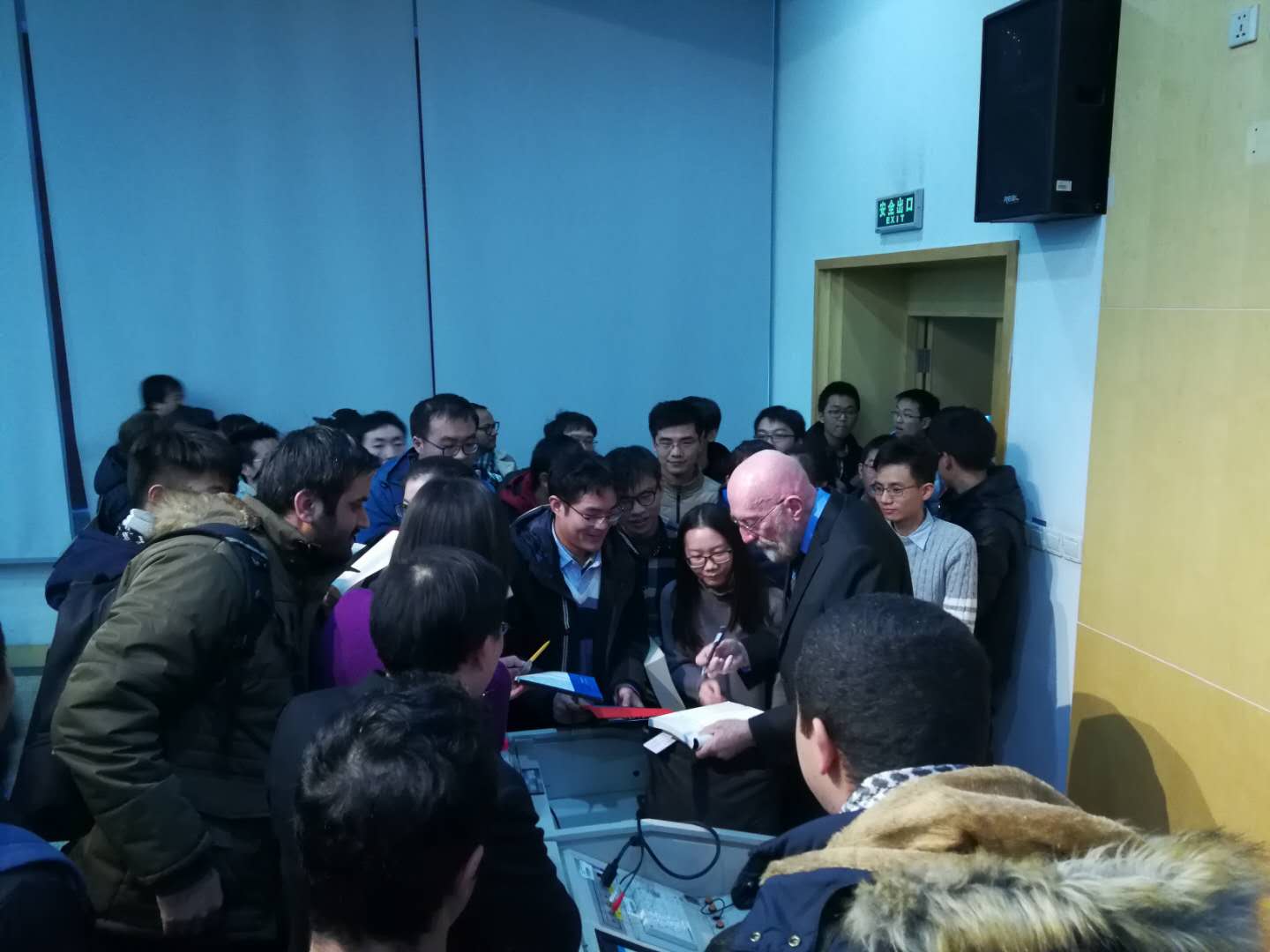 报告后的提问环节,现场气氛热烈,大家踊跃地向索恩教授提出了很多关于引力波理论研究、实验观测以及《星际穿越》电影中的科学问题,索恩教授耐心地给予回答。活动结束后大家纷纷与索恩教授合影并索取签名留念。