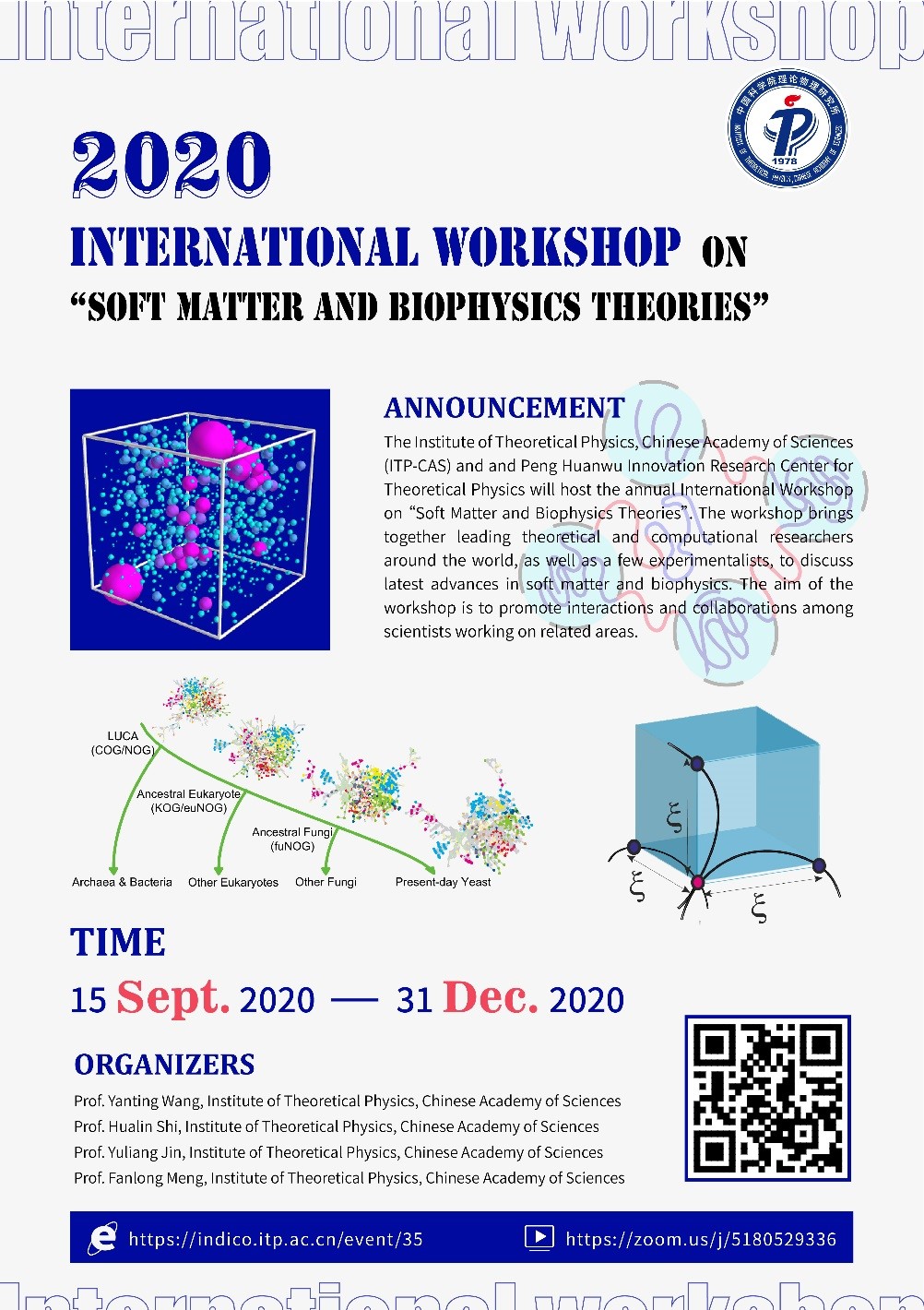 2020年9月15日-12月17日,由中国科学院理论物理研究所彭桓武理论物理创新研究中心主办的“2020软物质和生物物理理论国际研讨会”(2020 International workshop on “Soft Matter and Biophysics Theories” )在理论物理所成功举办(https://indico.itp.ac.cn/event/35)。