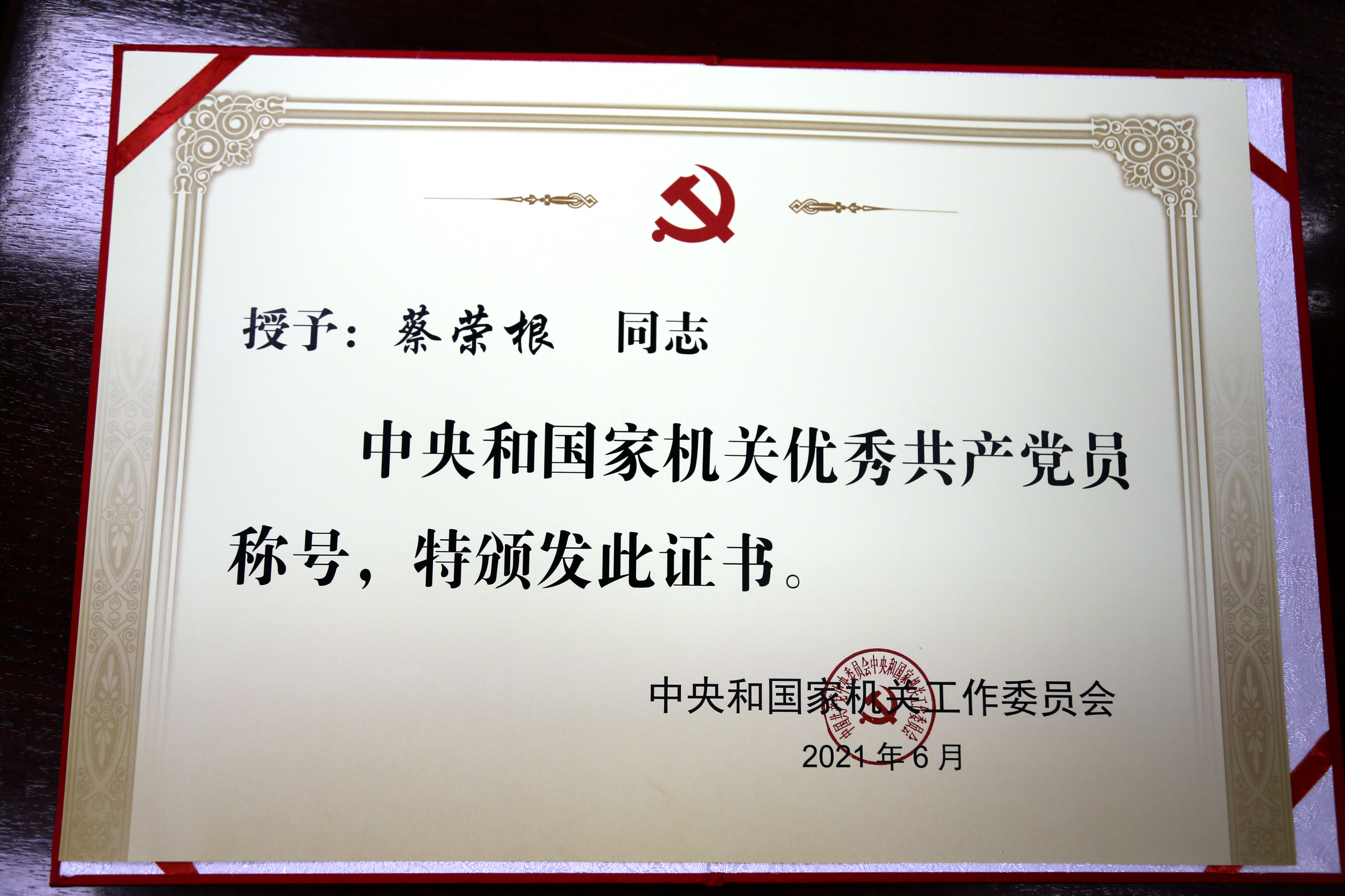2021年6月24日,在中国共产党成立100周年之际,中央和国家机关隆重召开优秀共产党员、优秀党务工作者和先进基层党组织表彰大会。中共中央政治局委员、中央和国家机关工委书记丁薛祥出席会议并讲话。理论物理所蔡荣根同志荣获中央国家机关工委“优秀共产党员”称号,在此向蔡荣根同志表示祝贺,并希望广大党员向优秀共产党员、优秀党务工作者、先进集体学习,在新时代新征程上肩负重大使命、贡献更大力量。