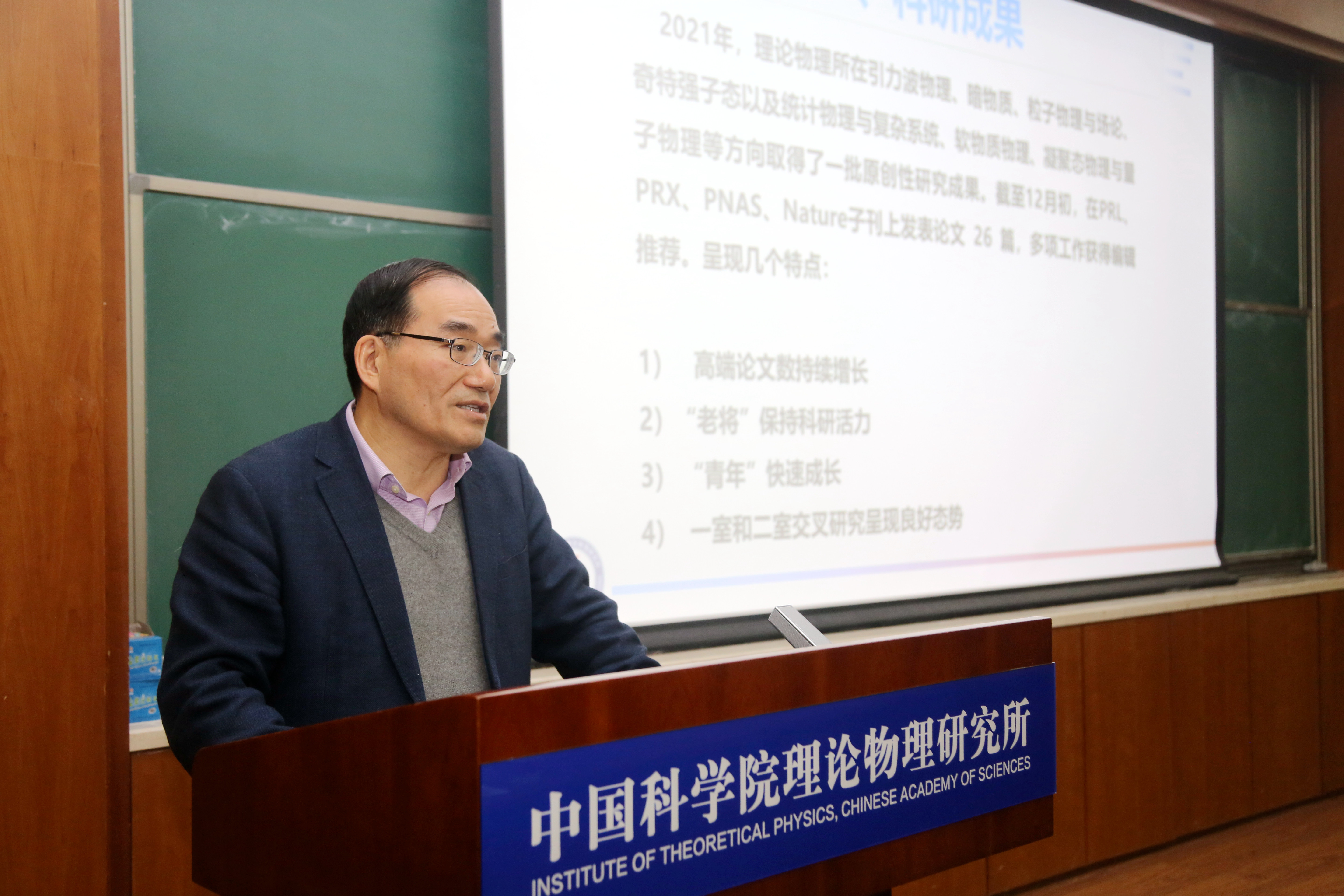 所长、党委书记蔡荣根在研究所工作报告中指出,过去一年,所班子、所党委深入学习贯彻习近平新时代中国特色社会主义思想,认真学习总书记关于科技创新的重要论述和最新重要讲话精神,坚持政治引领,将全所同志思想统一到当好“国家队”、“国家人”,扛起“国家事”、“国家责”上来,主动担负国家战略科技力量主力军的职责使命,扎实开展党史学习教育、弘扬科学家精神、面向国家需求调整科研布局,制定十四五规划,在党建、科研工作、人才队伍建设等方面取得了长足进步。特别是在引力波物理、暗物质理论、粒子物理与场论、奇特强子态以及统计物理与复杂系统、软物质物理、凝聚态物理与量子物理等领域取得了一批重要的原创新成果,高端论文数持续增长。蔡荣根认真分析了研究所当前存在的不足,如党建工作特别是在科研骨干中发展党员工作需进一步加强;重要科研项目需加强组织,优秀科研骨干的引进还缺乏有力措施和条件保障,管理队伍建设和管理效能还需进一步加强等。面对新形势、新要求,蔡荣根指出,2022年,所党委将深入学习习近平新时代中国特色社会主义思想,坚决贯彻落实中央和院党组重要战略部署,做好党的二十大精神学习。坚持和加强党的全面领导,切实做到党建工作与科技创新工作同谋划、同部署、同推进、同考核。充分发挥党支部战斗堡垒作用和党员先锋模范作用,加强青年职工思想政治引领,发挥党委委员联系党外科研骨干作用,做好科研骨干发展党员工作。落实“基础研究十条”,进一步改革研究所科研组织模式、人才引进机制、布局面向国家需求的研究队伍,开展建制化,定向性基础研究。加强管理支撑队伍建设,提升管理效能。加强科研经费管理,促进科研成果产出。