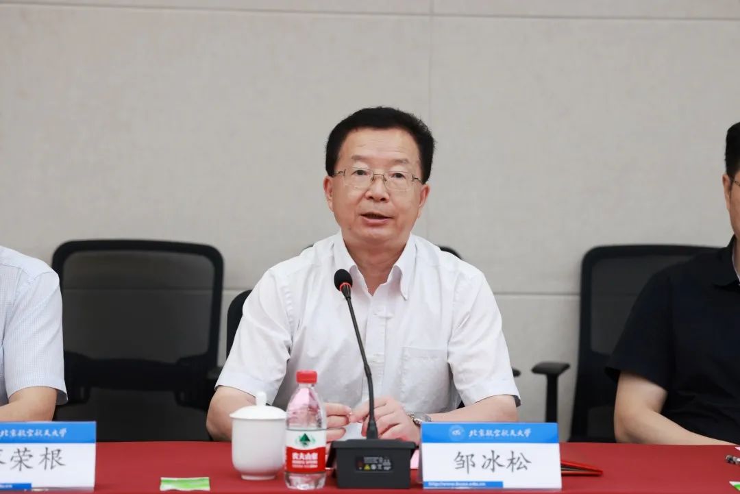 徐惠彬对蔡荣根、邹冰松一行表示热烈欢迎。他指出,理论物理研究在自然科学研究中具有重要意义、在国家科技发展战略中占据重要地位。北航为国而生、与国同行,以服务国家为最高追求,始终围绕国家重大战略需求开展人才培养和科学研究。他表示,中心的成立旨在汇聚国内外高端人才,进一步提升青年教师及研究生的培养水平,全面提升服务国家重大战略需求和探索国际科学前沿的竞争力。希望以此次中心建立为契机,与理论物理所密切联系、深化合作、高效互动、优势互补,聚焦重大前沿科学问题,促进交叉学科发展,探索创新型人才的培养模式,为国家大科学工程提供有力支撑,为实现高水平科技自立自强做出新的更大的贡献!