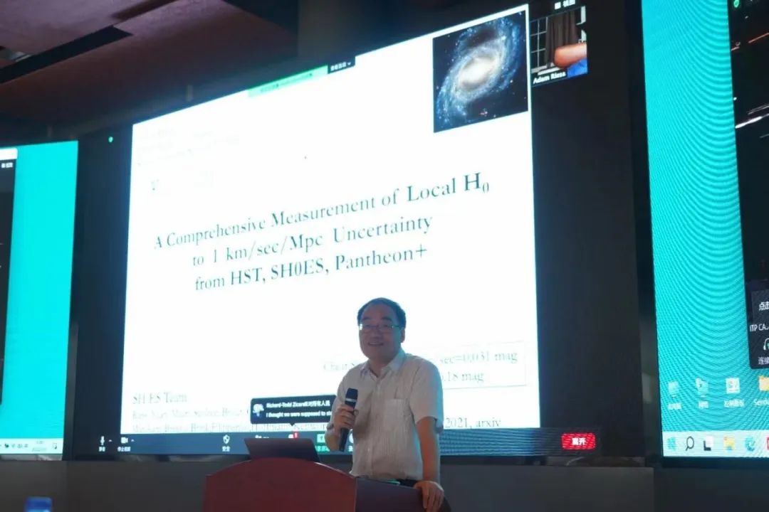 蔡荣根院士随后介绍了Adam Riess教授最近二十年对哈勃常数坚持不懈的测量,特别是他所领导的SH0ES团队借助距离阶梯对哈勃常数的最新测量与普朗克卫星给出的宇宙学标准模型中的哈勃常数存在超过5个标准偏差的冲突,这对宇宙学标准模型提出了严肃的挑战。