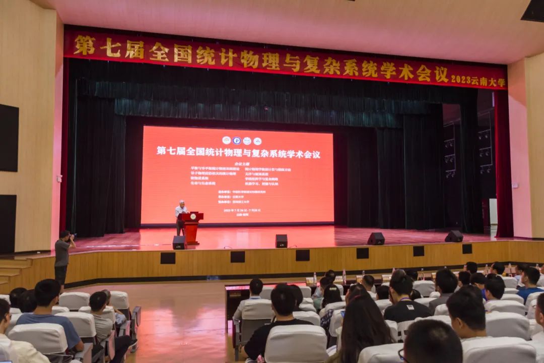 第七届全国统计物理与复杂系统学术会议于2023年7月26日至28日在云南大学成功举行。会议由中国科学院理论物理研究所主办,云南大学承办,昆明理工大学协办,云南大学物理与天文学院院长郑波教授担任会议总负责人。云南大学吴涧副校长致欢迎辞。中国科学院理论物理研究所副所长周善贵研究员讲话。学术委员会主席、中国科学院理论物理研究所欧阳钟灿院士,浙江大学林海青院士、北京师范大学胡岗教授等特邀嘉宾,以及近1000名来自全国各地高校和科研机构的代表参会。本届会议是从2009年在厦门大学召开的预备会议及2011年在南京师范大学召开的第一次正式会议以来,历届会议中参会人数最多的一次。