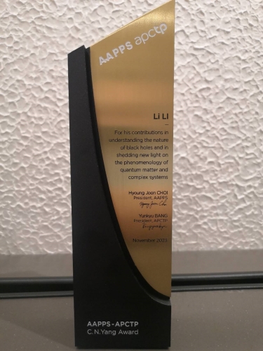 AAPPS-APCTP“杨振宁奖”(C. N. Yang Award)由亚太物理学会联合会和亚太理论物理中心共同设立,旨在表彰在亚太地区取得突出研究成果的青年科研人员,以促进亚太地区物理学领域青年科学家的发展。“杨振宁奖”每年颁发一次,每次授奖3人,2023年为第十二届,李理为近几届获奖者中引力和宇宙学领域唯一获奖者。今年同获此殊荣的还有来自香港城市大学的李丹枫教授和北京师范大学的张立勇教授。理论物理所何颂研究员曾获得2019年度“杨振宁奖”。
