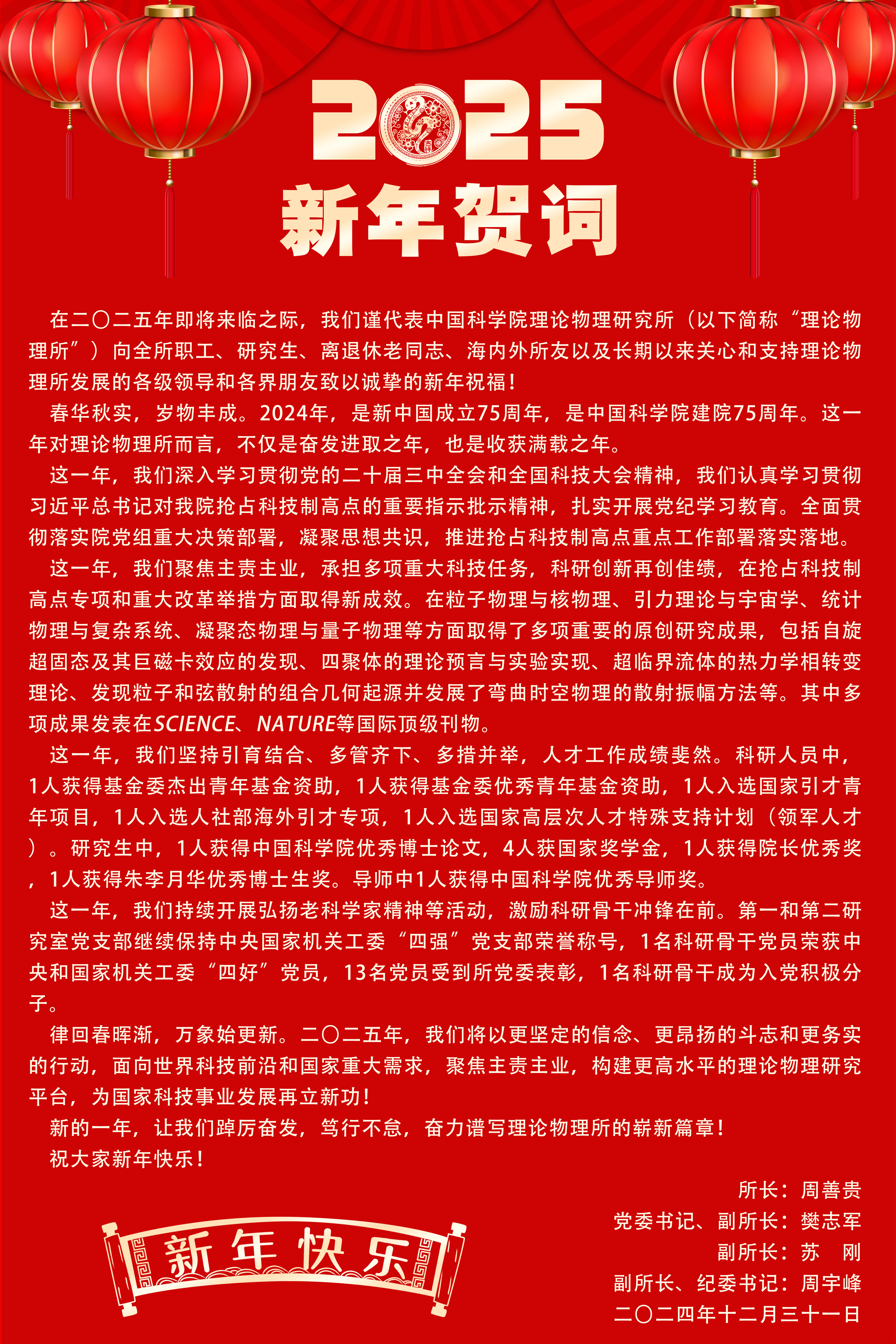 在二〇二五年即将来临之际,我们谨代表中国科学院理论物理研究所(以下简称“理论物理所”)向全所职工、研究生、离退休老同志、海内外所友以及长期以来关心和支持理论物理所发展的各级领导和各界朋友致以诚挚的新年祝福!