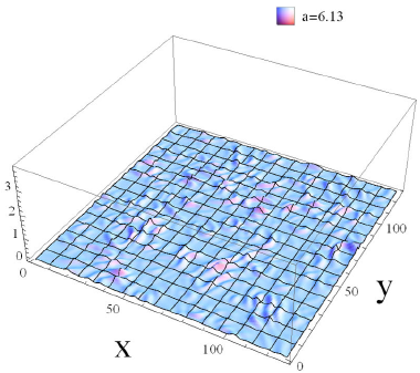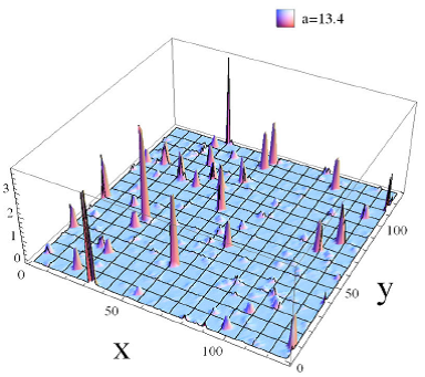 最近,理论物理研究所博士研究生刘京,研究员郭宗宽,研究员蔡荣根与中国科学院大学萧文礼教授合作,他们研究了一类具有尖角势函数的暴胀模型。这样一类尖角势函数可以在超弦理论中的一些非微扰效应中出现。他们发现该模型产生的原初密度扰动和原初引力波与目前的宇宙微波背景辐射观测数据一致,在暴胀结束的宇宙重加热阶段能够产生具有双峰结构的随机引力波能谱。该能谱与一般的暴胀场产生的单峰能谱显著不同;该预言能够被将来的LIGO实验所检验。暴胀结束后暴胀场在尖角势函数的极小值点附近震荡,由于势函数的二阶导数是狄拉克函数,暴胀场的能谱在动量空间一些区域随时间剧烈增长,产生大量的能量聚集的震荡子结构(见下图,在二维切面上能量密度随时间的演化),暴胀场自身变得极不均匀。这种空间不均匀的结构导致了很强的随机引力波背景的产生。