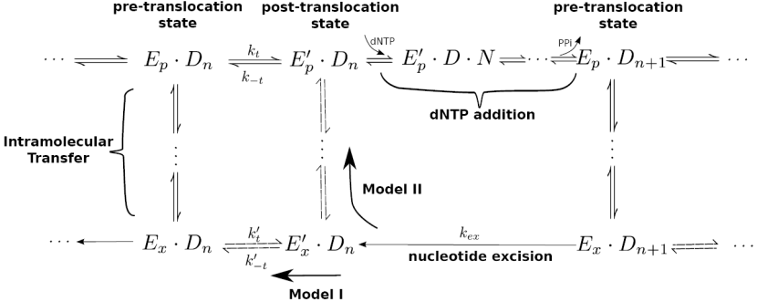 DNA聚合酶(DNAP)是细胞内最重要的分子机器之一,负责催化受模板链指导的DNA链聚合过程(即通过Watson-Crick配对实现遗传信息的高保真复制),是遗传信息得以稳定维持和表达的基础。结构生物学和生物化学研究表明,典型的DNAP都包含聚合位点(Pol,记为P)以及外切位点(Exo,记为E),两位点相互协作,实现对遗传信息的高速、高保真复制,典型的保真度(即复制出错率的倒数)大约为106~109。 关于DNAP的高保真机制,已经积累了大量的结构生物学、生物化学和单分子生物学研究。目前普遍的共识是Pol与Exo两个位点分别承担不同的功能(图一)。Pol位点能选择性地催化核苷酸单体的共聚反应,即其催化位点的几何构型(大小、形状等)能较容易地容纳与模板核苷酸配对的核苷酸单体,而不容易接纳错配碱基,因此主要将配对碱基而非错配碱基添加到DNA复制链的生长端。这一“核苷选择”是DNAP高保真的第一个来源,现有实验初步确定其对保真度的贡献大约为104~106量级。另一方面,生长链的末端会在热涨落作用下摆动到Exo位点并被切除。如果末端掺入的是错配,则上述过程很容易发生;而如果末端是正确配对,则上述过程发生的概率很小,由此能实现对末端错配的高效率校对。这一“剪切校对”是DNAP高保真的第二个来源,现有实验估计其对保真度的贡献大约为102~103量级。  图一 DNAP两位点相互协作的“共聚-校对”过程示意图。 早在1970年代,著名物理学家J.Hopfield就指出上述复制保真度不可能源于配对和错配之间的热力学(自由能)差别,而是源于两者的动力学(反应速率)差异。此后大量实验对Pol、Exo两位点的催化动力学分别进行了细致的实验研究,但由于理论分析上的困难(如下),长期以来一直缺乏一个系统的理论框架能将所有动力学信息整合起来,从而精确预测、计算复制速度、保真度等重要物理量。理论分析最核心的困难在于一旦引入了“剪切校对”过程,则描述整个“共聚-校对”过程的动力学方程将变为无穷多个级联方程组,数学上没有现成的方法可以解析求解这类方程组。此外,DNAP的共聚反应、校对反应中还可能存在高阶的末端近邻效应(即,添加或剪切末端单元的速率可能都依赖于其近邻的多个单元),这类效应可能对DNAP保真度有显著影响,例如,当生长链末端发生错配时,若下一步聚合的速度降低、而末端被转移剪切的速度升高,则这个一阶近邻效应会显著提升校对效率(即提升保真度)。这类高阶近邻效应对于动力学建模和分析引入了额外的复杂性和难度。 针对上述复杂情况,国科大物理学院黎明和理论物理所舒咬根等综合各种实验观测结果,提出了一个完整的DNAP“共聚-校对”反应模型(图二),建立了系统的定态动力学的理论分析框架,并对相应的无穷大级联方程组给出了精确、系统的数学处理,从而能将已知的动力学信息整合起来,计算预测保真度等重要物理量。特别是,针对含有任意阶近邻效应的保真度问题(例如图三所示的一阶、二阶效应),他们在相当宽的参数范围内导出了保真度的近似解析表达式(图四),系统、直观地揭示了Pol、Exo两位点的各阶近邻效应如何相互匹配从而决定了最终的保真度,并且明确了决定保真度的极少数关键动力学参数。在此基础上,结合DNAP中双链DNA的特殊结构数据,他们进一步提出,典型的两位点DNAP应该存在着一阶直到四阶的近邻效应、且各阶效应的量级大致相当,从而高阶近邻效应对校对效率的贡献可能将大大高于目前认可的值(102~103量级),这一预测将在未来的实验中得到检验。  图二 DNAP“共聚-校对”动力学模型  图三最小“共聚-校对”动力学:一阶近邻效应(左),二阶近邻效应(右)  图四 h-阶近邻效应对保真度的贡献。f是总体保真度,fs表示Pol位点“核苷选择”的贡献,fe表示Exo位点“剪切校对”的贡献。 上述研究成果发表于J. Phys.: Condensed Matter 29(2017)025101。论文得到了审稿人的高度评价,并被选为当期的亮点工作在其官网上介绍 (https://jphysplus.iop.org/2017/01/26/a-quantitative-understanding-of-high-fidelity-dna-polymerase/)。2018年2月,论文又被该杂志选为2017全年度的亮点工作之一进行推荐介绍(http://iopscience.iop.org/journal/0953-8984/page/Highlights-2017)。 该工作还先后受邀在首届生物马达国际会议(Aug. 16-19, 2017, Ohio, USA)和第11届国际生物医学工程和系统联席会议(BIOSTEC 2018, Jan. 19-21, Funchal, Madeira, Portugal)上作邀请报告。 |