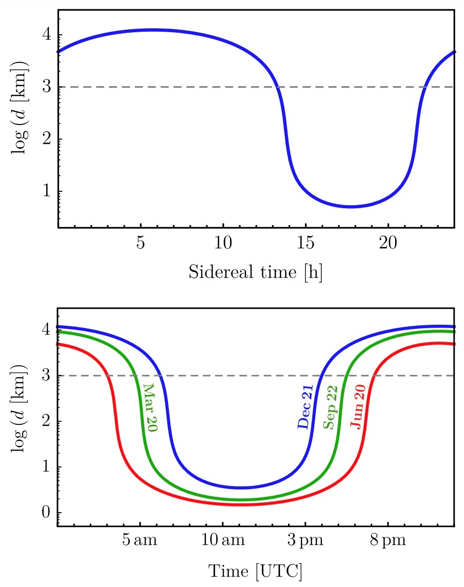 物质从银河中心传播到达格兰萨索国家实验室时穿越地球的距离在一个恒星日内的变化。下方为从太阳方向过来的加速暗物质穿行地球距离在一个太阳日的变化,同时随着季节不同而变。