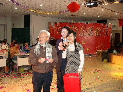 团拜会之初,吴岳良所长首先发表了简短却是热情洋溢的贺词,他对大家一年来的辛勤工作表示感谢,对大家所取得的成绩表示祝贺,同时也代表理论物理所送出了新春的祝福。随后研究生、老师、离退休老同志纷纷登台,或是表演自己的拿手节目,或是参加各种有趣的游戏,几位多才多艺的小朋友还向大家表演了小提琴、舞蹈、歌曲、朗诵等节目为团拜会再添喜庆,由所里研究生杨硕、霍运杰表演的相声《我崇拜的物理学家》,可谓是有理论所特色的节目。两位表演者把对牛顿、爱因斯坦的崇拜之情与理论所的生活相结合,幽默风趣地细数了两位物理学家的主要贡献,一次次逗得大家轰堂大笑。恰逢鼠年,耗子们也火了一把,游戏《耗子捉猫》,独具新意,学术上的权威、工作上的领导--“猫”,被自己的学生、职员--“耗子”,追的到处乱跑,简单的一个小游戏,却体现出了理论所自由、宽松、开放、和谐的氛围。