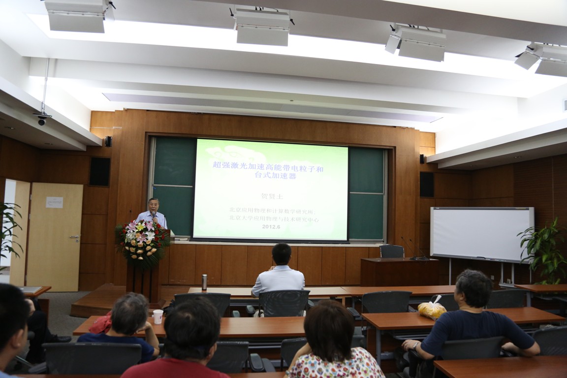 中国科学院院士贺贤土先生于2012年6月26日上午在中国科学院理论物理研究所/理论物理国家重点实验室联合举办的中关村交叉论坛暨理论物理前沿论坛上做了题为“带电粒子强场加速”和“高能量密度状态下温稠密物质研究”两场报告。