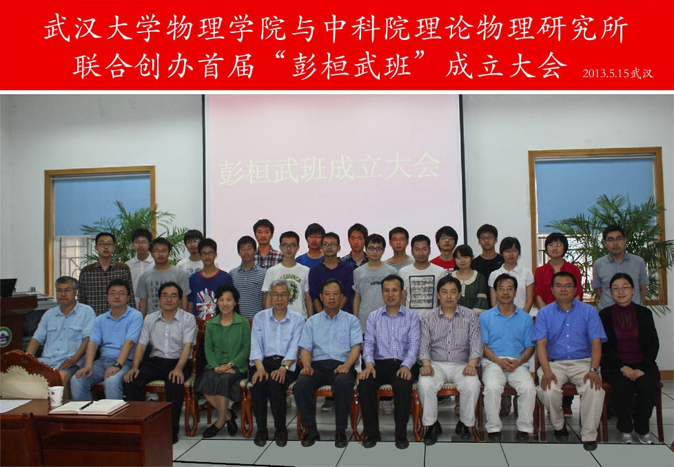 2013年5月15日下午,理论物理所与武汉大学联合创办的首届“彭桓武班”开班仪式在武汉大学物理学院隆重举行。武汉大学副校长李斐、教务部副部长赵菊珊、物理学院刘昌院长、王建波副院长、田贵华副书记、国家名师姚端正教授,及我所欧阳钟灿院士、陈晓松副所长、蔡荣根研究员、易俗研究员等共同出席了开班仪式。首届“彭桓武班”的全体同学参加了开班仪式。