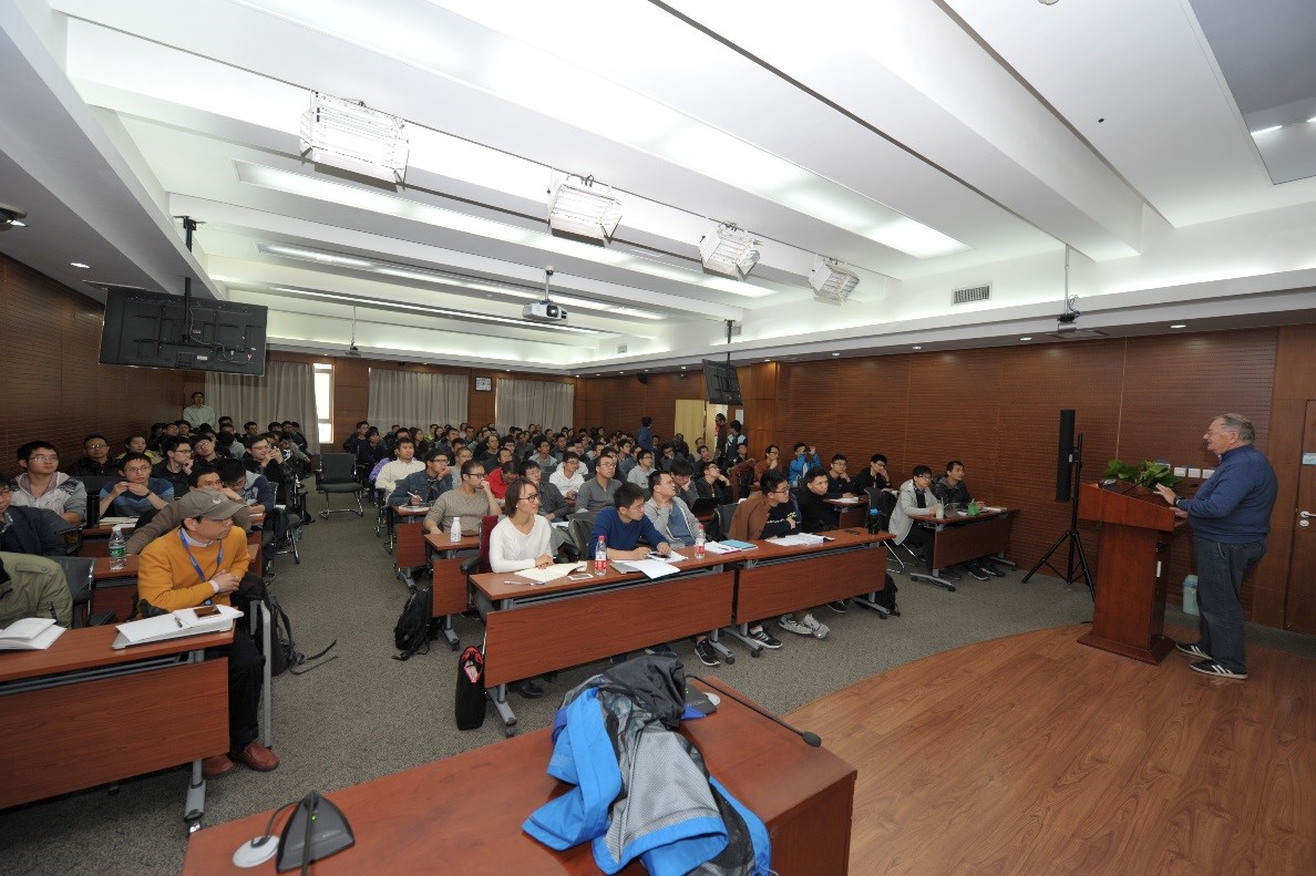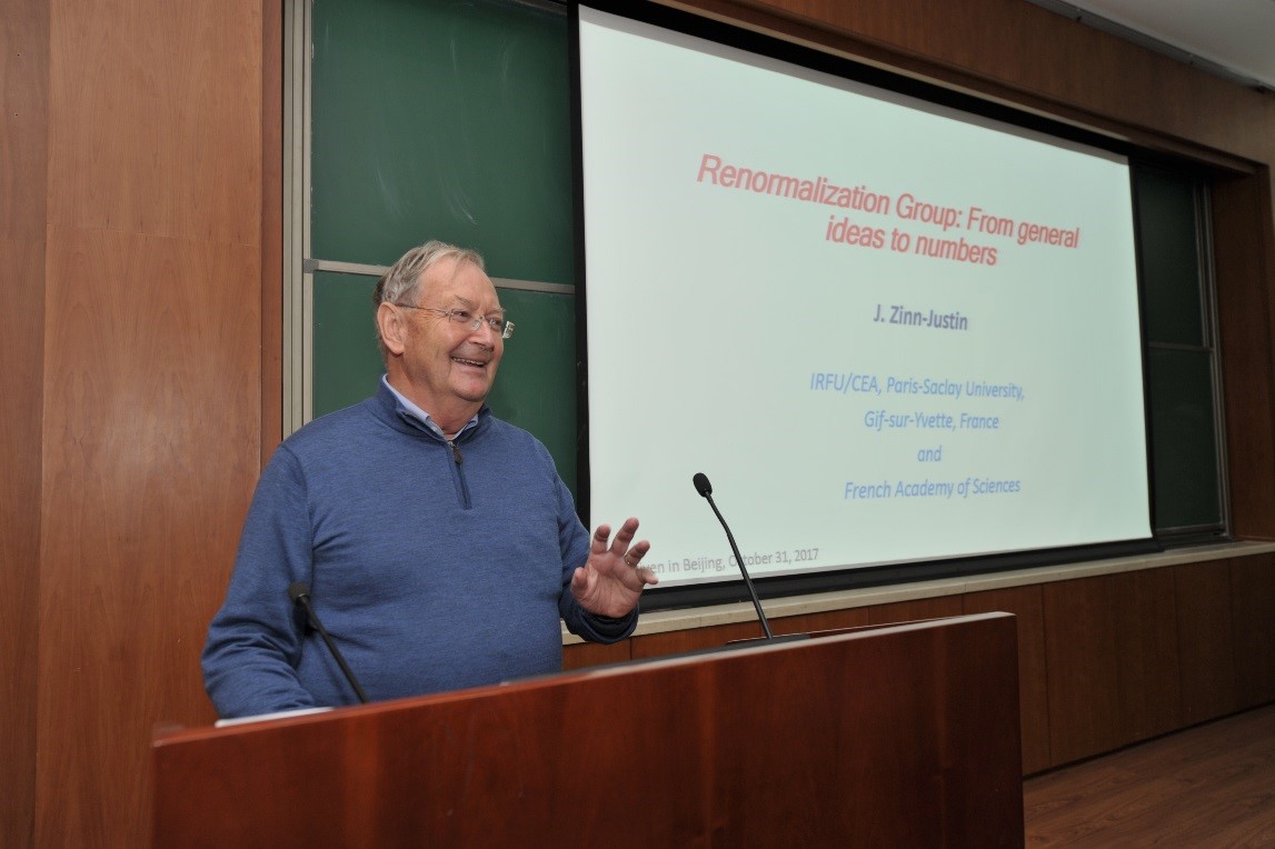 2017年10月31日至11月8日,法兰西科学院院士、量子场论和统计物理权威、重整化群理论的先驱之一 Jean Zinn-Justin 教授访问我所,与我所周海军研究员、田矗舜研究员就带拓扑项的非线性 sigma 模型的重整化以及随机矩阵中的相变等共同感兴趣的问题进行讨论,并作了 7 次共计 14 学时的 “相变与重整化群” 系列高级讲座。 参加此次系列高级讲座的学员包括中科院理论物理所、物理所,北京大学、清华大学以及外地科研院所统计物理、凝聚态物理与量子场论方向研究人员和研究生共120多人。 Zinn-Justin 教授以其撰写的研究生教材《相变与重整化群》(北京大学出版社,2014年)的最核心章节为主线,对重整化群理论的精髓和关键计算方法作了深入浅出和系统性的介绍。 Zinn-Justin 教授结合他本人对统计物理的深刻理解和在重整化群理论发展中的独特经历对讲授内容做了独到安排,内容涵盖了随机行走、标度理论、费曼图技术、可重整性概念、高斯模型、O(N)模型、Callan-Symanzik方程、Gell-Mann--Low 方程、泛函方法、Wilson重整化群理论、普适性与临界指数计算等等。系列讲座有助于学员理解重整化群方法的理论精髓和掌握相应的计算方法,也有助于学员在讲座结束之后继续系统地自学这本优秀教材。此外,Zinn-Justin 教授在讲座中还结合重整化群理论的建立过程介绍了对理论物理研究的深刻体会,这些体会对于刚刚进入理论物理研究的学生也很有启迪。