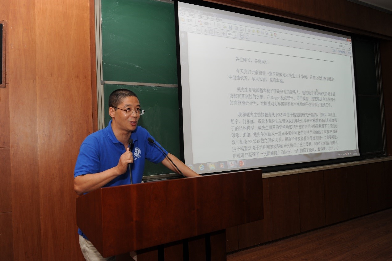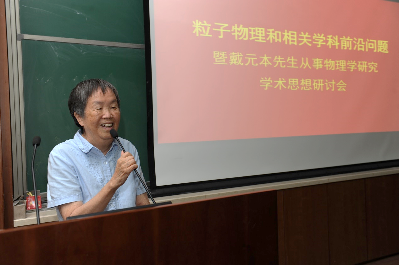 在接下来的发言中,戴先生的好朋友们,高能物理所张宗烨院士、数学与系统研究院周龙骧研究员、北京大学宋行长教授、高能物理所黄涛研究员介绍了戴先生的学术成就,并回忆了与戴先生一起合作共事时的难忘经历。戴元本先生是我国著名理论物理学家,主要从事粒子物理理论和量子场论方面研究工作。戴元本先生的一项重要工作是层子模型的研究,层子模型工作获1982年国家自然科学二等奖。在量子场论方面,戴元本先生首先提出用重整化群方程研究物理粒子的电磁形状和大角度散射的方法,使得能够利用重整化群方程讨论实际问题。戴元本先生还研究了非Abel规范场六阶微扰论中费米子电磁形状因子的渐近行为,他通过大量计算最初提出领头项指数化的猜想。戴元本先生的其它工作还涉及到手征自发对称破缺的新计算方法、中微子物理和重味物理等问题。戴元本先生编撰的《相互作用的规范理论》,是几代粒子物理专业研究生的重要参考书,对于推动中国的规范理论研究起了重要作用。高能所黄涛研究员用“治学严谨、为人厚道”八个字来概括戴先生的学术生涯, 大家对戴元本先生严谨的治学精神、对我国早期理论物理事业的贡献和推动,以及对年轻的科技工作者的提携和培养表达了崇高的敬意!