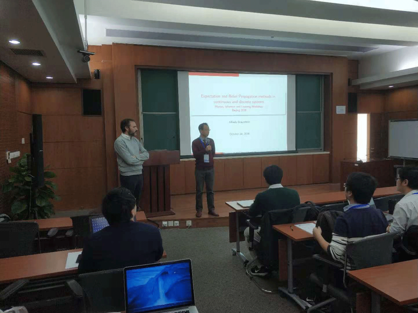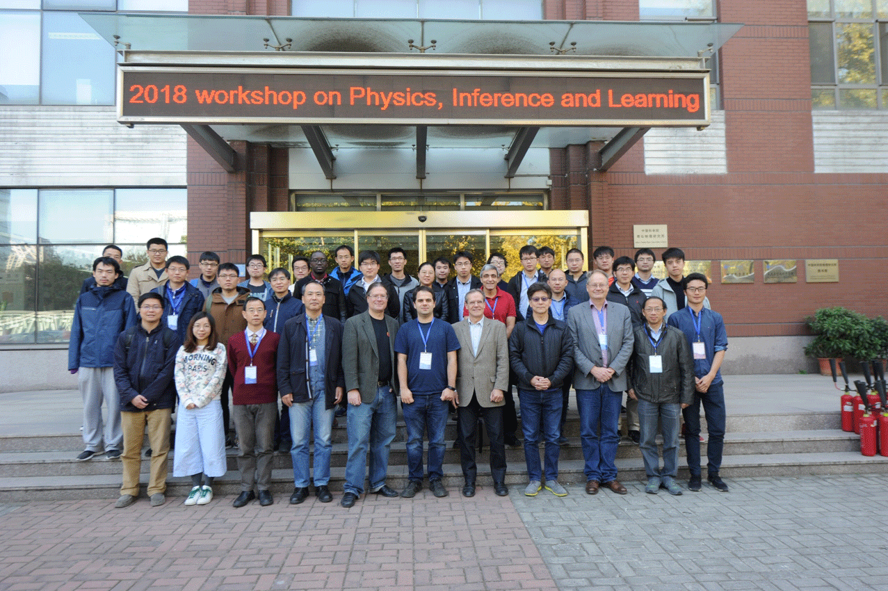 由中国科学院理论物理研究所彭桓武理论物理创新中心资助的“物理、推断与学习”冬季学习与国际研讨会于2018年10月28-11月3日在中国科学院理论物理研究所成功举行。 该冬季学校邀请了法国巴黎高师校长Marc Mézard教授、美国圣塔菲研究所Cristopher Moore教授、 日本东京工业大学Yoshiyuki Kabashima教授、意大利都灵理工大学Alfredo Braunstein教授、中科院物理研究所王磊研究员、人民大学谢志远教授等六位活跃于统计物理与机器学习国际前沿的学者为教员,讲授信念传播、期望传播、复本方法、空腔方法、统计生成模型、张量网络、统计推断、感知学习、玻恩学习机、多层深度网络等基础理论和现代计算方法。在随后的国际研讨会上,有来自中国大陆高校及研究所,华为,腾讯等知名企业、香港地区、美国、英国、日本、意大利、瑞典等地的21位邀请报告人就统计物理、统计推断、机器学习的前沿问题汇报进展,讨论未来发展方向。参加冬季学校和国际研讨会的与会学者和学生人数接近80人。该冬季学校和国际研讨会的授课和邀请报告内容也已经传到网络上供感兴趣的研究人员参考,见网址 http://pil2018.csp.escience.cn  周海军研究员致辞  Marc Mézard教授作报告  会场情况  会议合照 |