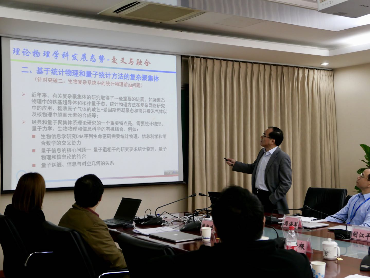 4月23日上午,中科院发展规划局在我所组织召开理论物理研究所“一三五”规划调整论证会。论证会邀请了来自中科院物理所、高能所、国家天文台,以及北京大学、清华大学、中国工程物理研究院的9位科研人员,以及中科院发展规划局,条件保障与财务局,前沿科学与教育局、人事局组成专家组,对理论物理所“一三五”规划调整进行咨询论证,孙昌璞院士担任专家组组长。 谢鹏云局长介绍了中科院“一三五”规划组织实施情况和重要意义,简述了院“一三五”规划调整的程序要求,希望专家对调整内容把关。蔡荣根所长汇报了研究所“一三五”规划的整体实施进展及调整方案,周宇峰和周海军研究员分别对调整后的突破进展情况做了具体汇报。与会专家深入讨论,认为调整后的规划符合研究所定位,特色鲜明,一致同意调整内容。下一步提交中科院秘书长办公会和院长办公会审议。 蔡荣根所长强调,理论物理所将继续秉持和发扬“两弹一星”科学精神和“开放、交融、求真、创新”的文化传统,面向世界科学前沿,面向国家重大需求,紧密围绕研究所“一三五”规划开展研究工作,努力争取成为国际一流水平的国家理论物理研究中心!