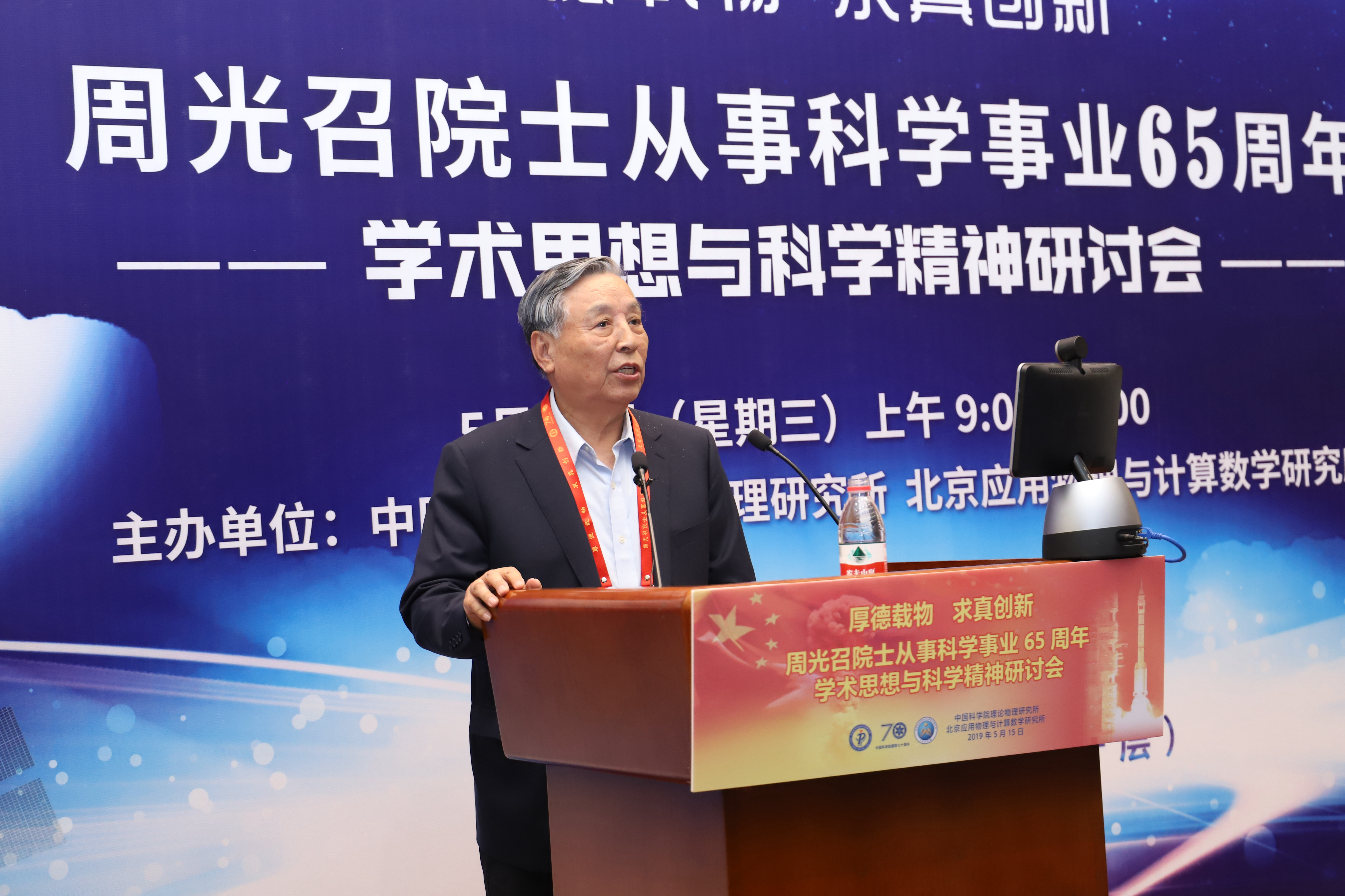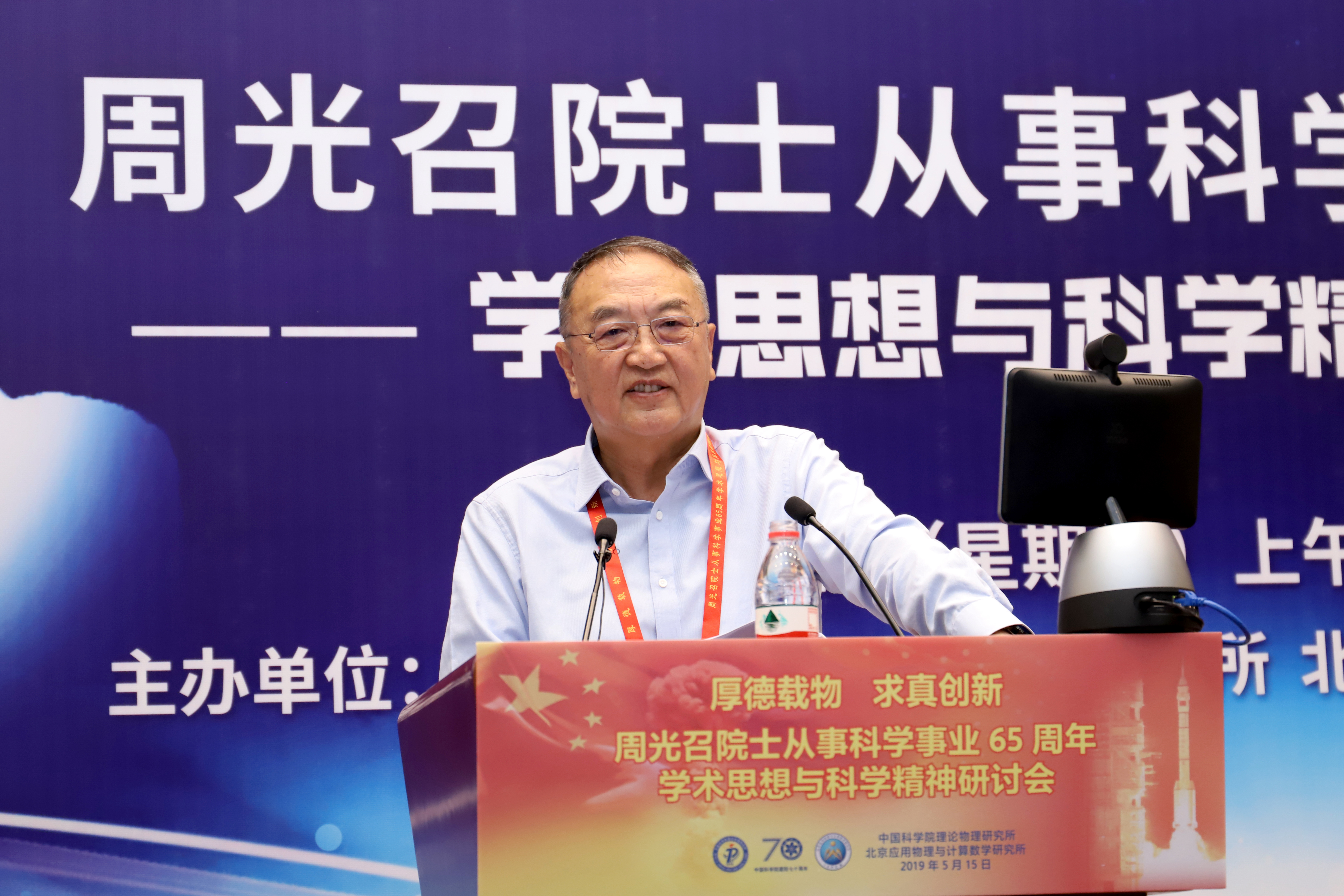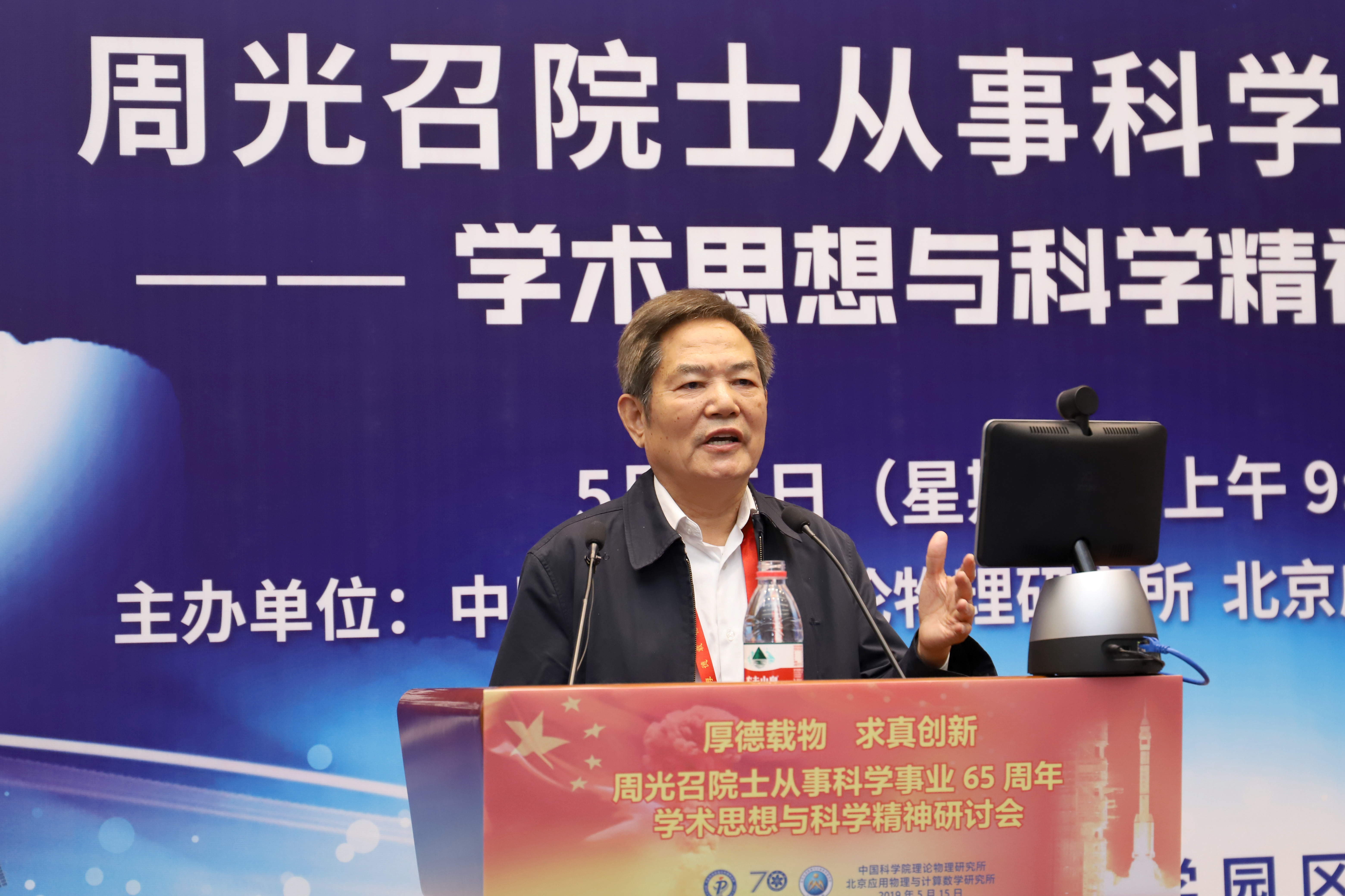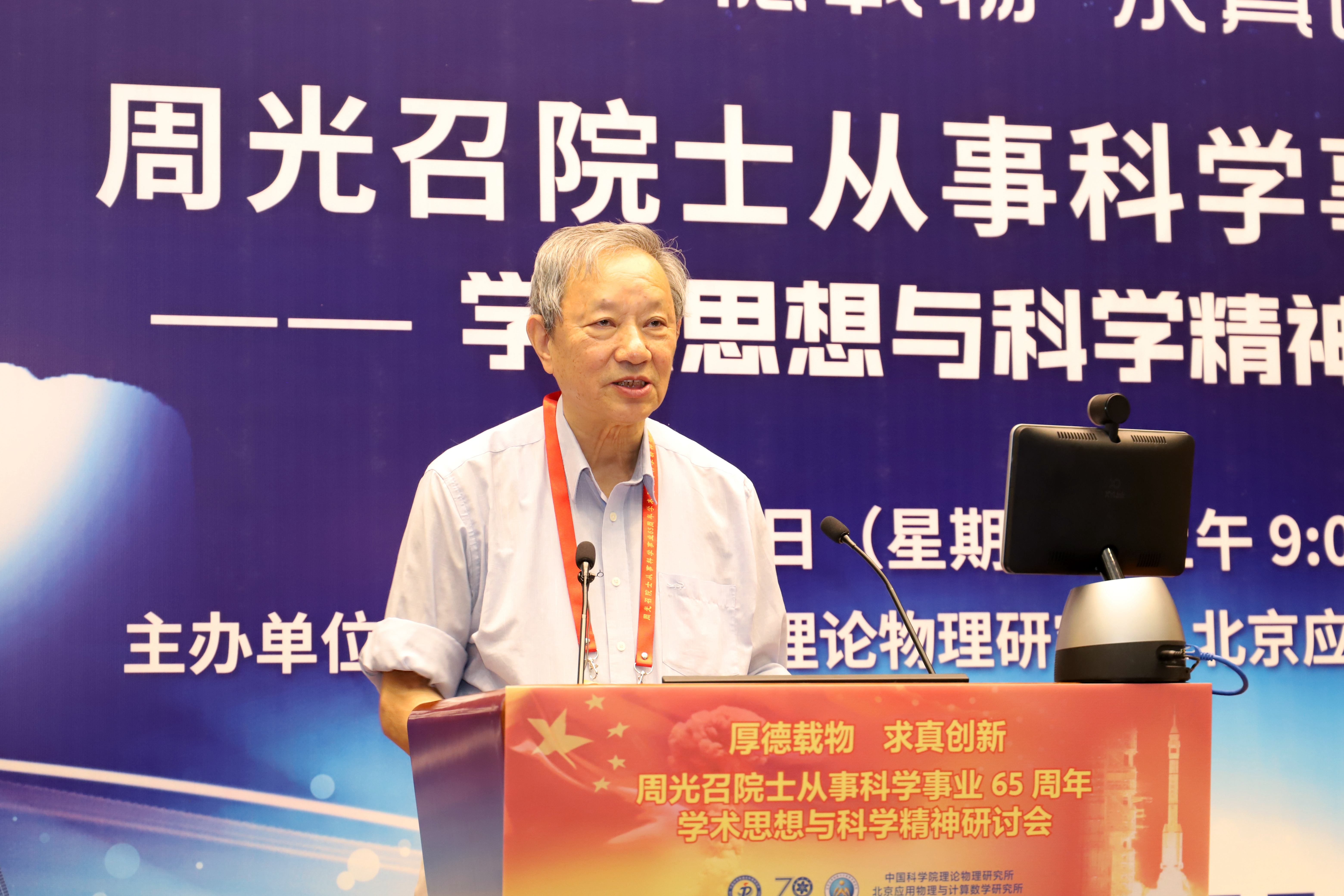 2019年是“两弹一星”功勋周光召院士从事科学事业65周年,也是新中国成立70周年、中国科学院建院70周年,5月15日恰逢周光召院士90华诞。为传承“两弹一星”精神,弘扬周光召等老一辈科学家严谨求实的科学精神,激励青年学子弘扬爱国奋斗精神,建功立业新时代,为中华民族伟大复兴做出贡献,中国科学院理论物理研究所与北京应用物理与计算数学研究所于5月15日联合举办了《周光召院士从事科学事业65周年学术思想与科学精神研讨会》。 诺贝尔物理奖获得者杨振宁出席研讨会并发言,叶铭汉院士宣读诺贝尔物理奖获得者李政道贺信。 全国政协副主席、中国科协主席万钢出席研讨会并发表重要讲话,中国科学院副院长李树深受中国科学院院长、学部主席团执行主席白春礼委托宣读贺信,中国工程院原副院长杜祥琬受中国工程院院长李晓红委托发言,国家自然基金委员会主任李静海,科学技术部基础司司长叶玉江代表科学技术部,中国物理学会原理事长杨国桢受中国物理学会理事长詹文龙委托,中国工程物理研究院院长刘仓理,清华大学校长周光召基金会“应用科学奖”第一届获得者邱勇,中国科学技术大学校长包信和,北京大学学科建设办公室主任张平文院士受北京大学校长郝平委托,中国科学院大学副校长苏刚代表中国科学院大学,湖南省科技厅副厅长、湖南光召科学技术基金会理事贺修铭等在研讨会上发言。 中国科协党组书记怀进鹏,国务院发展研究中心原主任党组书记张玉台出席研讨会。 科学技术部原部长徐冠华做“周光召院士对我国科技事业的贡献”主题报告,中国科学院大学副校长吴岳良做“周光召院士的学术成就”主题报告。 中国科学院原党组副书记郭传杰、联想控股董事长柳传志、中国科学院国科控股董事长吴乐斌、贺贤土院士、欧阳钟灿院士等到会发言。周光召院士的女儿周莹女士在研讨会最后作简短发言。 研讨会由中国科学院理论物理研究所蔡荣根院士、北京应用物理与计算数学研究所王建国所长主持。 出席此次研讨会科技界领导、专家、老同志和青年学生代表近300人,其中两院院士有包信和、蔡荣根、陈式刚、戴元本、杜祥琬、葛墨林、何祚庥、贺贤土、胡思得、怀进鹏、李静海、李树深、李惕碚、罗民兴、马余刚、欧阳钟灿、彭先觉、邱勇、沈文庆、苏肇冰、孙昌璞、王鼎盛、王恩哥、王震西、吴岳良、席南华、夏建白、邢定钰、徐冠华、杨国桢、杨振宁、叶朝辉、叶铭汉、于渌、张平文、张维岩、张肇西、赵光达、赵宪庚、赵忠贤、朱邦芬等40余名。 周光召由于身体原因没能出席研讨会。中科院院长白春礼、中国科协党组书记怀进鹏、中国工程院院长李晓红、清华大学校长邱勇等在研讨会前分别代表单位并以个人名义专程到医院看望了周光召。中科院物理所、中科院重大任务局等单位向研讨会发来贺信表示祝贺。 研讨会得到了中科院院士工作局的大力支持,纳入中国科学院建院70周年系列活动。研讨会也得到了中科院科学传播局、中国科协“周光召成长采集工程项目组”、中科院声像中心的大力支持。筹备组还将设立专题网站进一步宣传周光召的学术思想和科学精神。 周光召曾说“一个民族要在精神上站立起来,必须要有自信,必须要有伟大的科学家和重大的发明来提升整个民族精神和自信心。” 为传承周光召开放交融、求真创新的学术思想,弘扬周光召追求真理、实事求是的科学精神,研讨会筹备组将周光召关于科技创新、科学普及、基础研究、人才培养等部分讲话汇集成册,以飨读者。 周光召的学术思想与科学精神曾经深刻影响了我国理论物理、基础研究、科技事业的发展历程,也必将对我国理论物理学科建设、基础科学研究、科技事业未来发展、创新型国家建设产生深远影响。 让我们接力周光召的精神火炬,奋进新长征,紧密团结在以习近平同志为核心的党中央周围,为实现中华民族的伟大复兴的中国梦做出贡献。