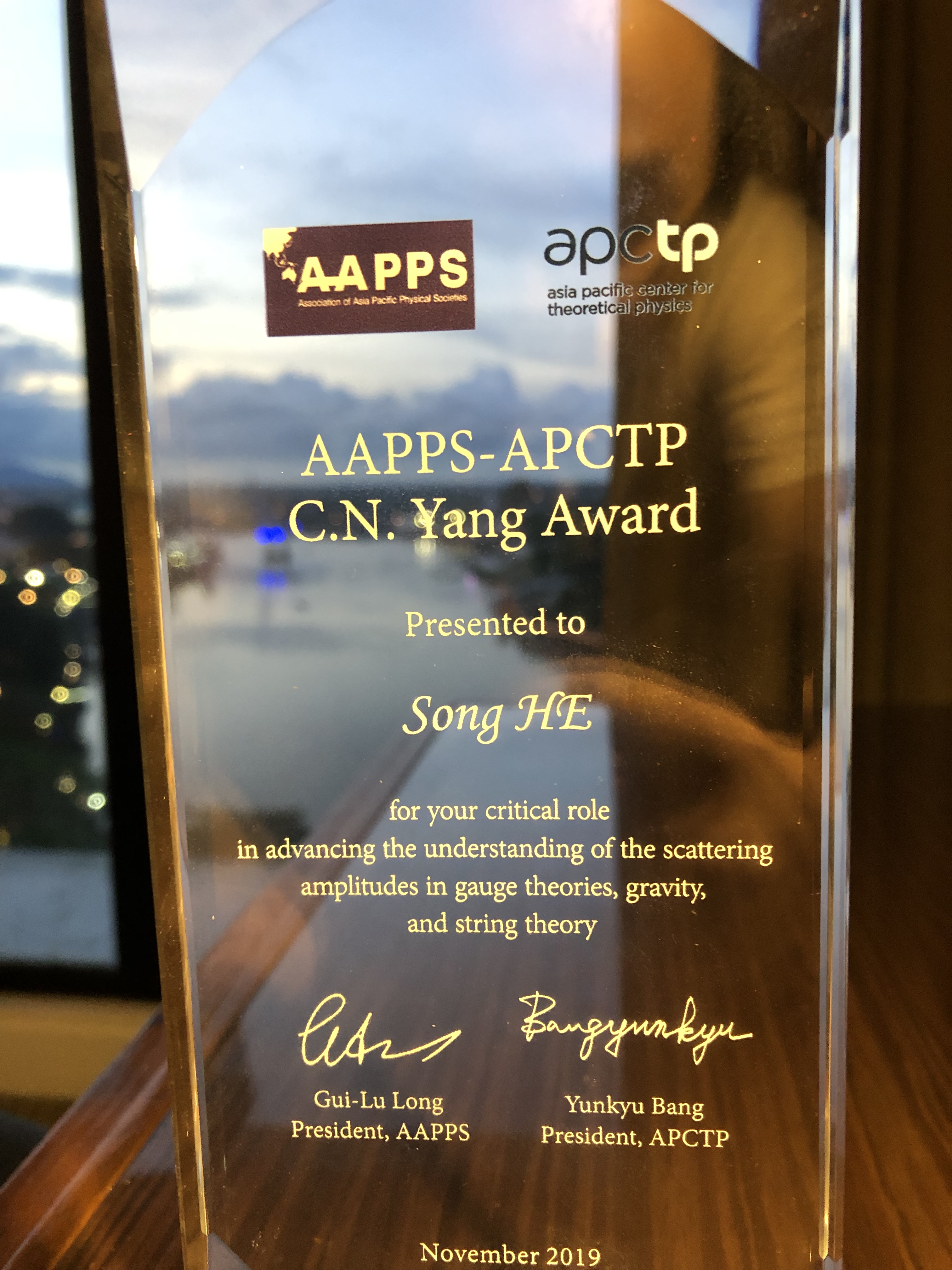 11月17日至22日,第14届亚太物理大会在马来西亚古晋举行。此次会议上颁发了2019年度“亚太物理学会联合会-亚太理论物理中心杨振宁奖(AAPPS- APCTP CN Yang Award)”,我所何颂研究员与悉尼科技大学Igor Aharonovich 教授、北京大学刘雄军教授获此殊荣。