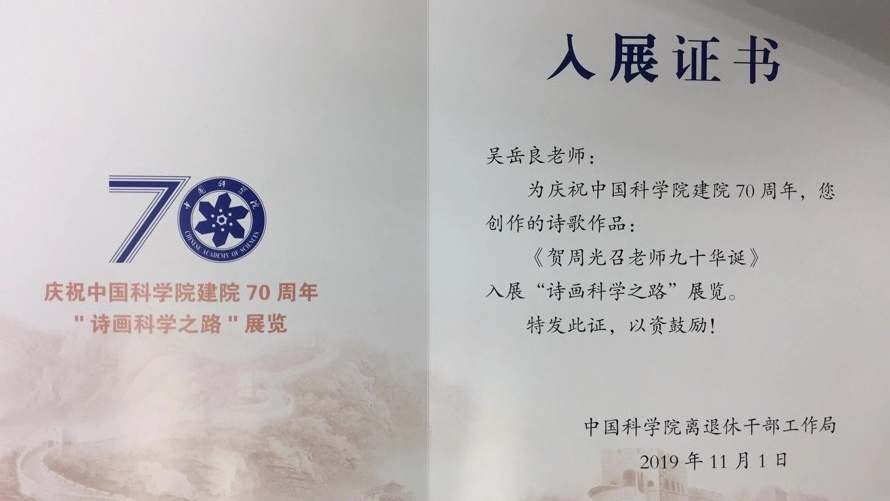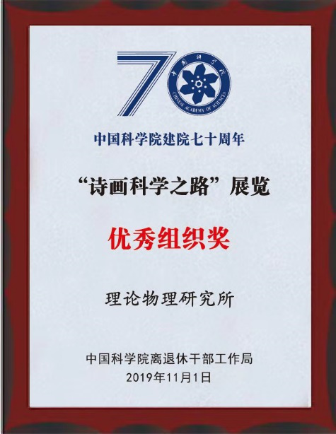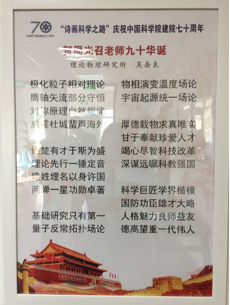 2019年是理论物理所老所长周光召先生90华诞,恰逢新中国成立70周年和中科院建院70周年。周光召先生的学生、理论物理所吴岳良院士著诗《贺周光召老师九十华诞》,并在庆祝中国科学院建院七十周年 “诗画科学之路”展览中展出,理论物理所也获得“诗画科学之路”展览优秀组织奖。
