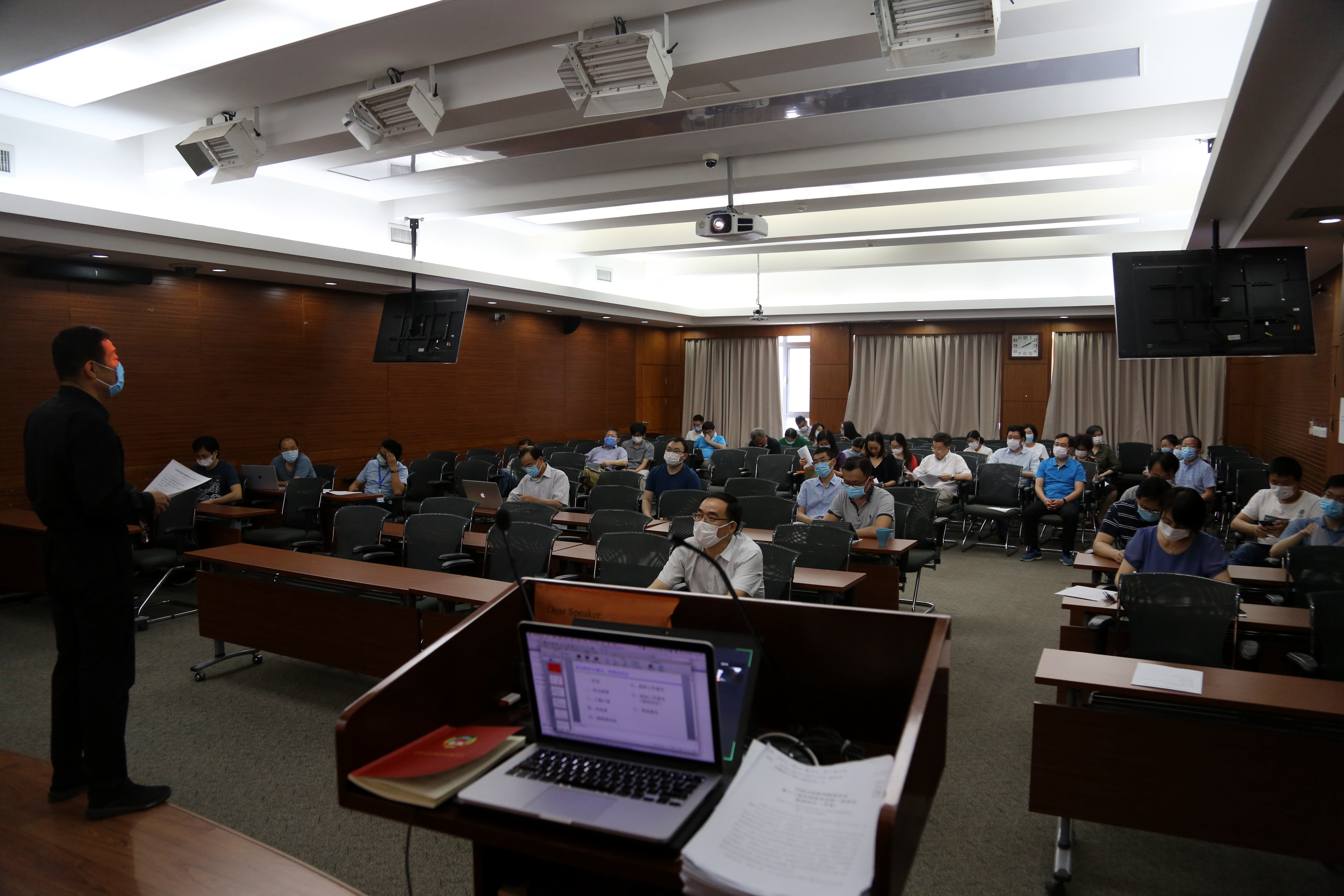 蔡荣根同志从今年两会在特殊时期召开用几个关键词介绍了今年两会议题的特点,对政府工作报告中关于“六稳”、“六保”、“民法典”、“港版国安法”、“依法治国”和“复杂国际形势”等内容进行了深刻解读。