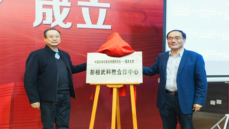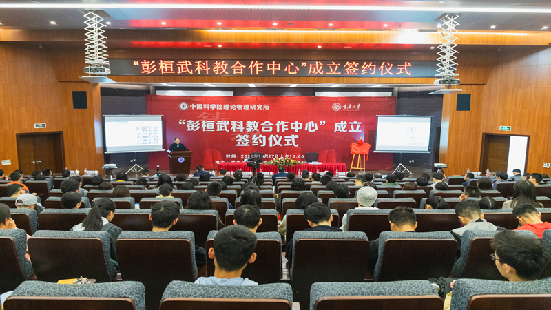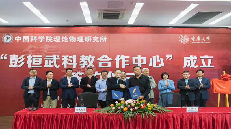 10月27日上午,中国科学院理论物理研究所—重庆大学共建“彭桓武科教合作中心”签约仪式在重庆大学虎溪校区理学部LA101会议室举行。理论物理所学术所长蔡荣根院士、张肇西院士、党委书记冯稷、人事教育处副处长郭舒婷,重庆大学校长助理夏之宁,国内合作办公室、校友工作办公室主任胡友强,物理学院党委书记韩忠、院长吴兴刚及学院全体领导班子成员出席。签约仪式由韩忠主持。
