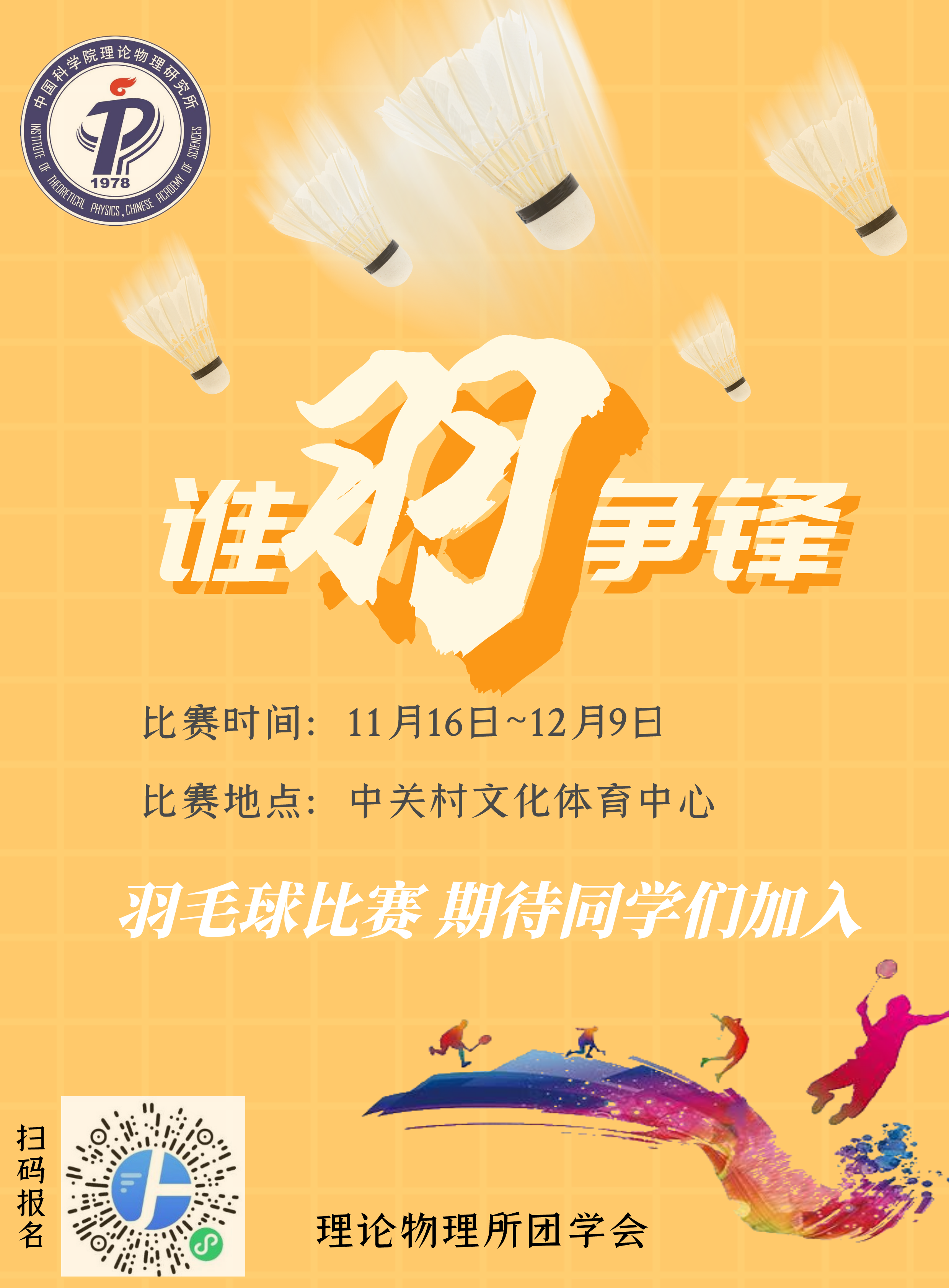 时值金秋,为了增强大家的体质,也为了给热爱羽毛球运动的同学们一个交流的平台,我所团学会计划于2020年11月16日至12月9日举办“谁羽争锋”羽毛球比赛,欢迎全所研究生和博士后积极报名参加。具体事项如下: