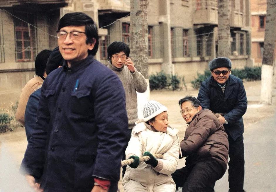 左一为苏肇冰院士,正在拔河的两位男同志是何祚庥院士(右二)、郝柏林院士(右一)