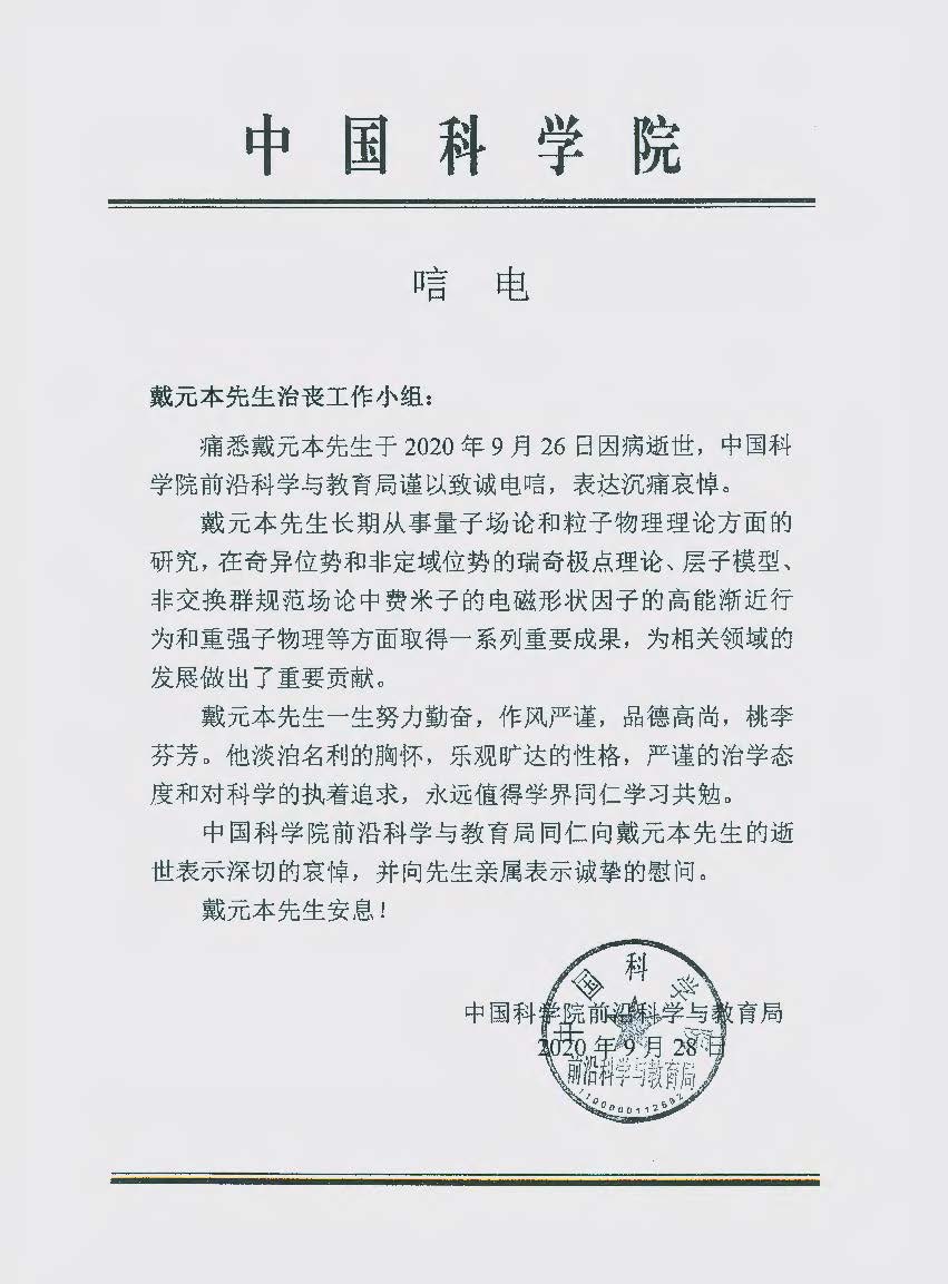 中国科学院前沿科学与教育局唁电