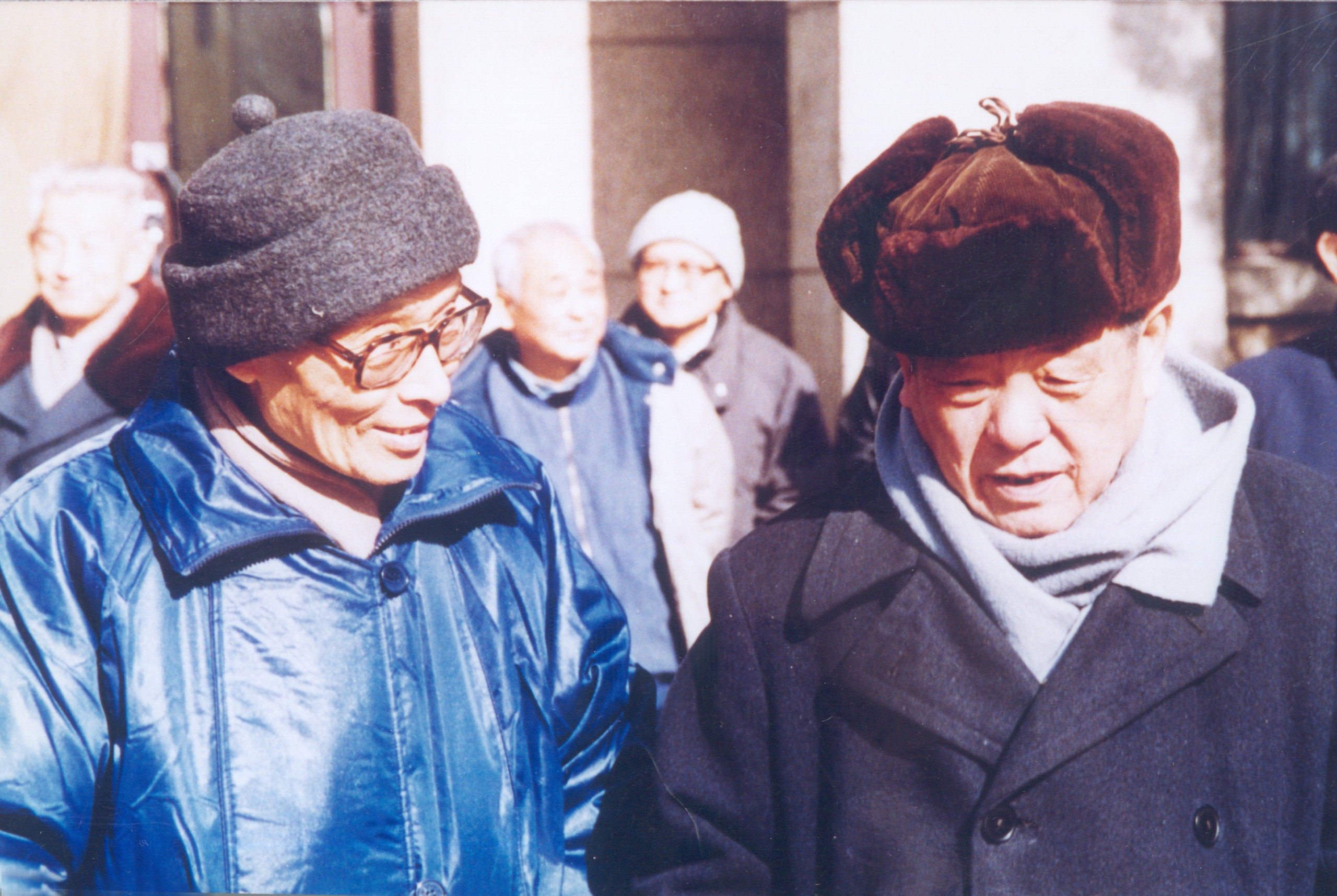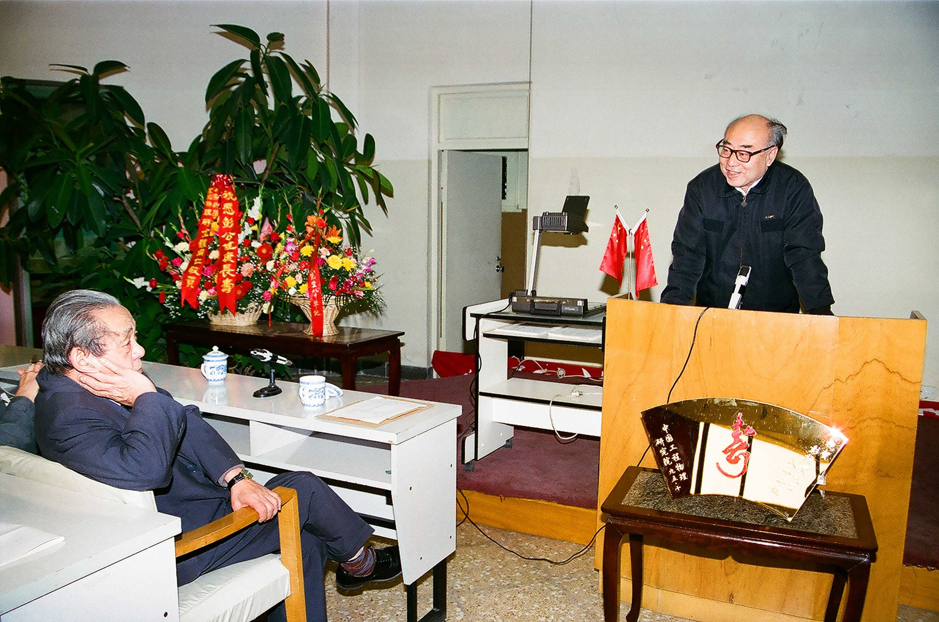 1996年,彭桓武祝于敏七十华诞时赋诗一首,中间站立者何祚庥