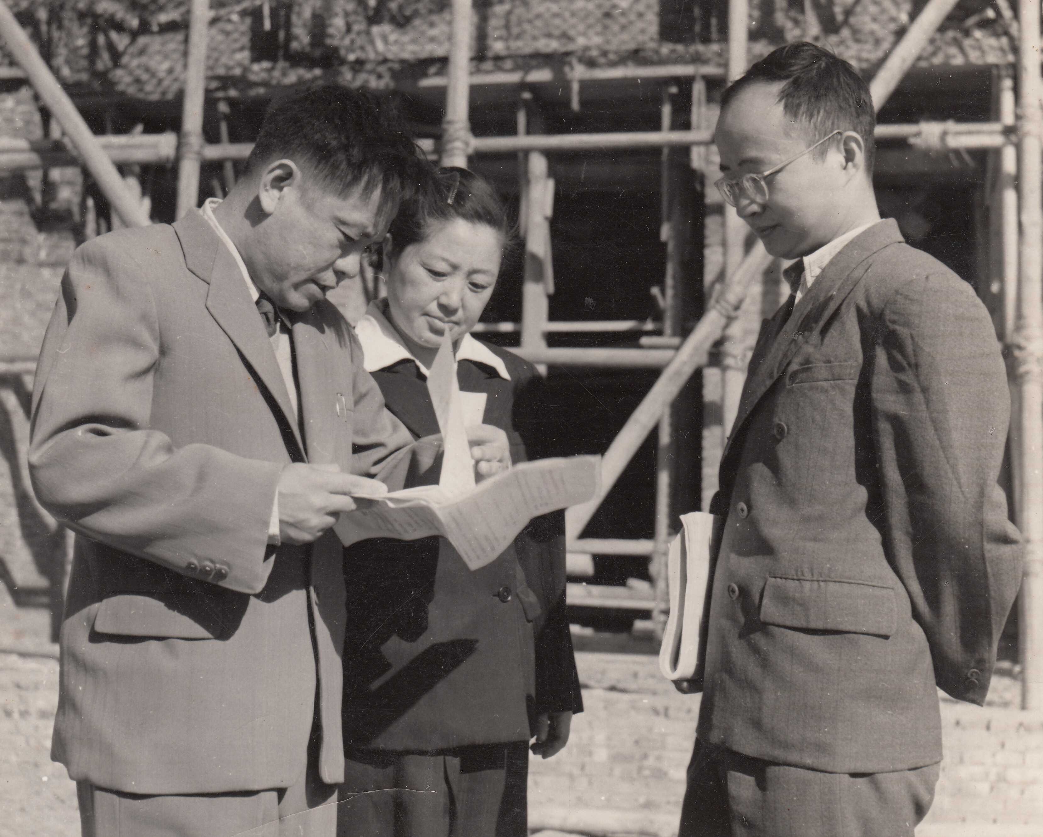 1959年,彭桓武(左一)、何泽慧(左二)、黄祖洽(右一)